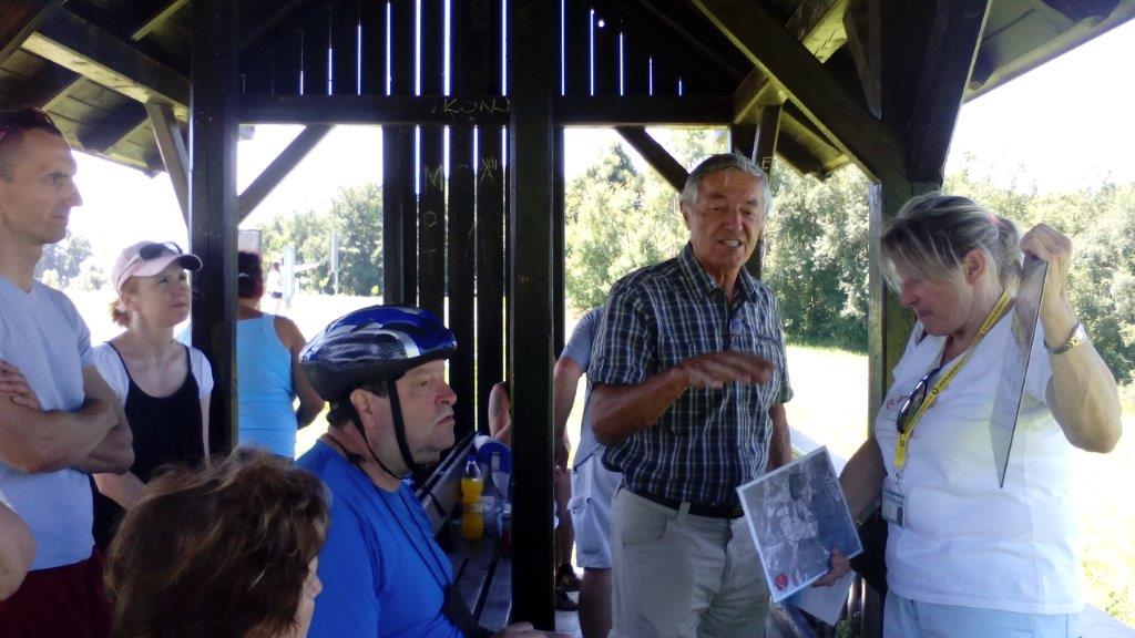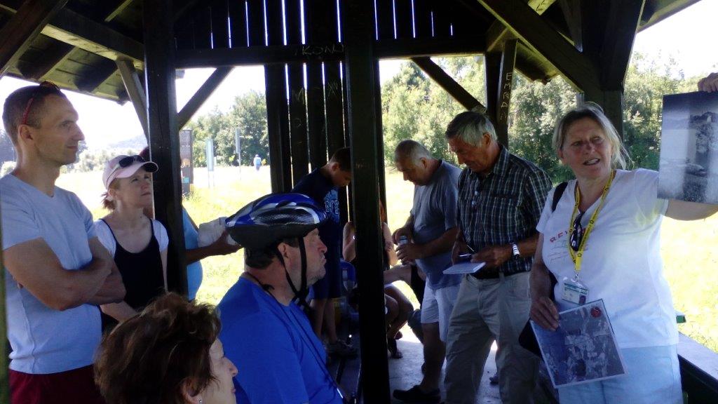 Od Ribiškega doma smo se napotili do mesta, kjer je nekoč stala restavracija Jezero in igrišče za mini golf ter se spomnili časov, ko je bilo to jezero še »turistično« oziroma »Velenjsko«, čeprav je za nas Škalčane še vedno »Špičkov tajht«. Obiskovalcem smo predstavili tudi dejavnost društva ter jim ponudili pelinkovec, eno od pijač naše mladosti. Na poti do mostu čez Lepeno je beseda tekla o velikih tombolah, Tičnici in gradu Turn, nato pa je Jože Šumah, predsednik Ribiške družine Velenje izčrpno opisal Škalsko jezero in življenje v njem. Pot smo nadaljevali do območja Perkavza, kjer smo s pomočjo starih fotografij, pesmi in pričevanj predstavili nekdanjo podobo Perkavza, Deberce in Rudolfšahta . Na poti do senčnice med jezeroma smo obiskovalcem na podoben način predstavili še druge zaselke, ki so deloma ali v celoti izginili: Pleterje, Ležen, Brezovo in seveda Škalski hrib, nekdanje središče kraja in celo doline. Beseda je tekla tudi o najdbah mastodonta, sanaciji ugreznin in urejanju rekreacijskega območja, ki je danes velikemu številu občanov v veselje in sprostitev. Končali smo s priporočilom, da se udeleženci kdaj tudi popeljejo s pletno po Velenjskem jezeru in si na otočku, t. i. Vodnem mestu, ogledajo našo razstavo Zgodbe z dna jezera. Ali pa se pridružijo kateremu od naših organiziranih vodenj, ki jih pripravljamo to poletje.
