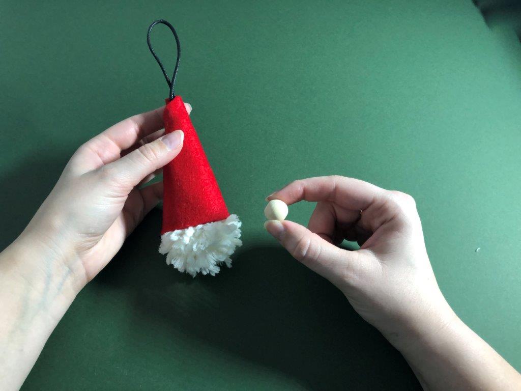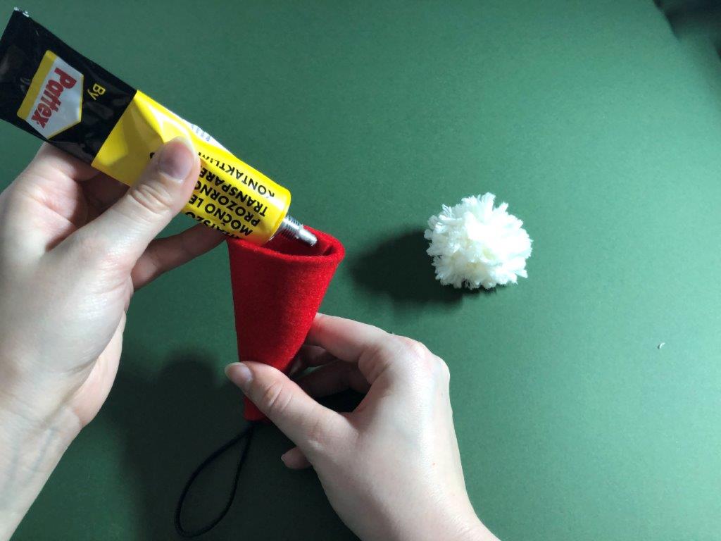 Kapico po želji okrasimo z bleščicami ali kakšnim drugim okraskom. Škratek za smrečico je končan!