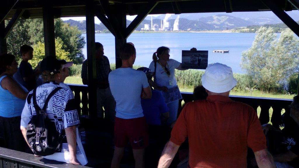Od Ribiškega doma smo se napotili do mesta, kjer je nekoč stala restavracija Jezero in igrišče za mini golf ter se spomnili časov, ko je bilo to jezero še »turistično« oziroma »Velenjsko«, čeprav je za nas Škalčane še vedno »Špičkov tajht«. Obiskovalcem smo predstavili tudi dejavnost društva ter jim ponudili pelinkovec, eno od pijač naše mladosti. Na poti do mostu čez Lepeno je beseda tekla o velikih tombolah, Tičnici in gradu Turn, nato pa je Jože Šumah, predsednik Ribiške družine Velenje izčrpno opisal Škalsko jezero in življenje v njem. Pot smo nadaljevali do območja Perkavza, kjer smo s pomočjo starih fotografij, pesmi in pričevanj predstavili nekdanjo podobo Perkavza, Deberce in Rudolfšahta . Na poti do senčnice med jezeroma smo obiskovalcem na podoben način predstavili še druge zaselke, ki so deloma ali v celoti izginili: Pleterje, Ležen, Brezovo in seveda Škalski hrib, nekdanje središče kraja in celo doline. Beseda je tekla tudi o najdbah mastodonta, sanaciji ugreznin in urejanju rekreacijskega območja, ki je danes velikemu številu občanov v veselje in sprostitev. Končali smo s priporočilom, da se udeleženci kdaj tudi popeljejo s pletno po Velenjskem jezeru in si na otočku, t. i. Vodnem mestu, ogledajo našo razstavo Zgodbe z dna jezera. Ali pa se pridružijo kateremu od naših organiziranih vodenj, ki jih pripravljamo to poletje.