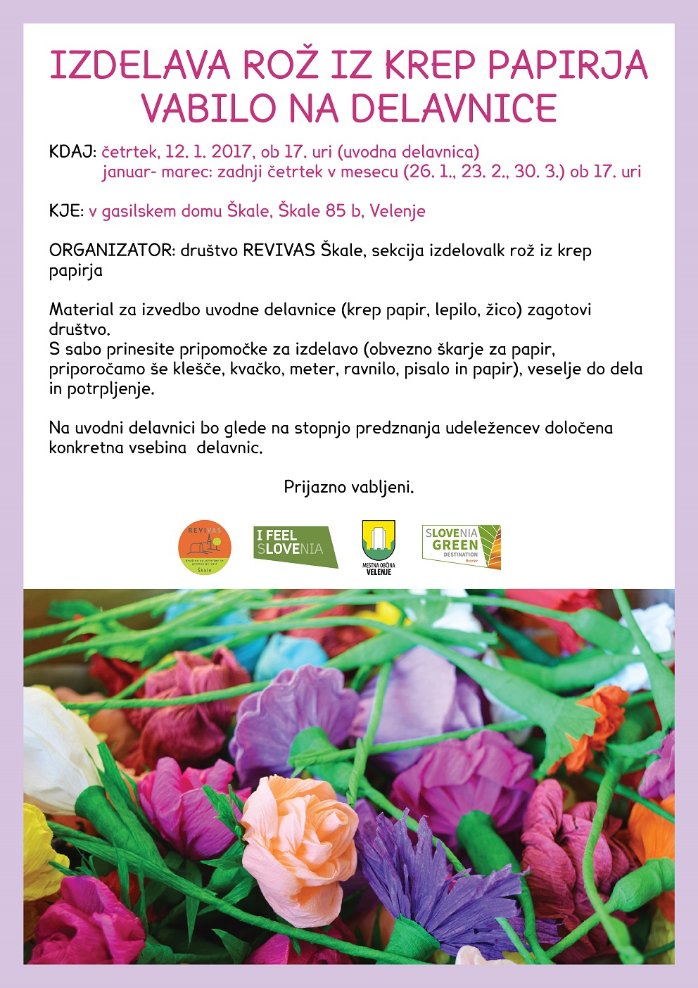 Naša sekcija izdelovalk rož iz krep papirja začenja z novim krogom delavnic izdelave rož iz krep papirja. Uvodna delavnica bo v četrtek, 12. januarja 2017, ob 17. uri v gasilskem domu Škale, naslednje pa predvidoma zadnji četrtek v mesecu od januarja do marca.