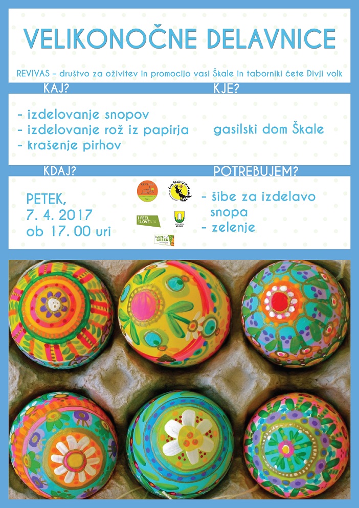 V petek, 7. aprila 2017, že osmo leto zapored organiziramo velikonočne delavnice. V garaži gasilskega doma Škale bomo med 17. in 19. uro izdelovali in krasili snope ter barvali pirhe.