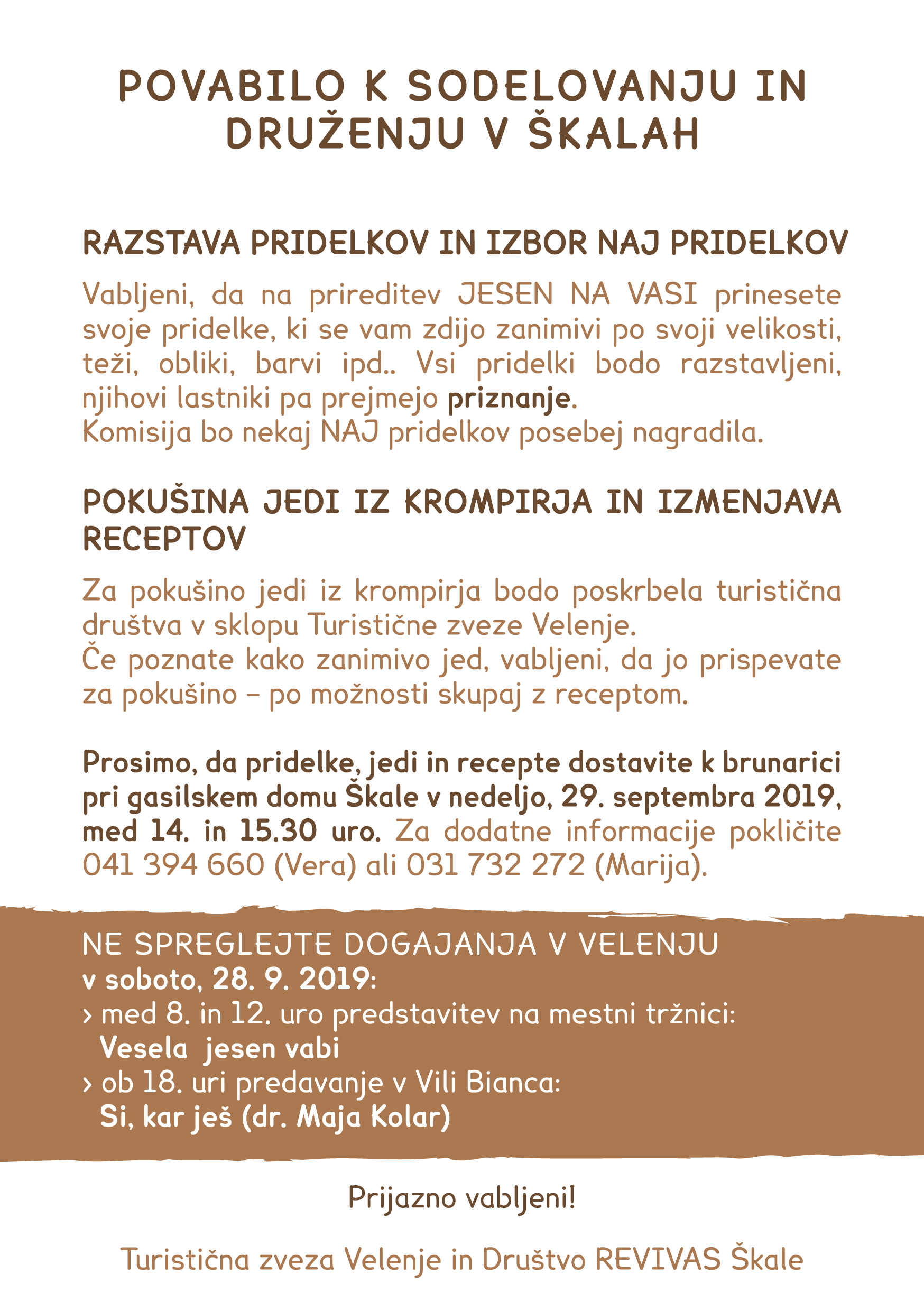 V sodelovanju s Turistično zvezo Velenje organiziramo v nedeljo, 29. septembra popoldne, pri gasilskem domu Škale tradicionalno prireditev JESEN NA VASI. Izbirali bomo NAJ pridelke, za obiskovalce pa bomo pripravili delavnice in zabavne igre ter pokušino jedi iz krompirja. V kulturno glasbenem programu sodelujeta Lovski pevski zbor Škale in pevke Gabrški cvet, pri izvedbi prireditve pa vsa turistična društva v zvezi.