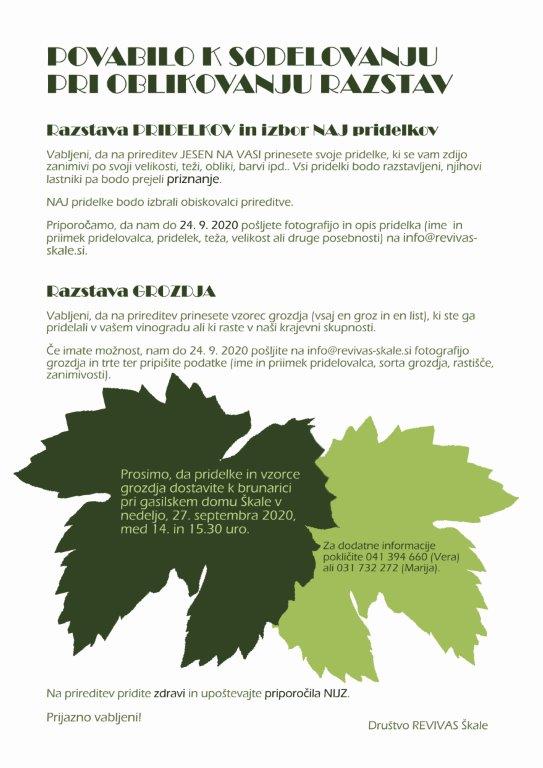 V nedeljo, 27. septembra 2020, popoldne bo pri brunarici ob gasilskem domu Škale potekala tradicionalna Jesen na vasi. Pripravili bomo razstavo pridelkov in grozdja, ki bo osrednja tema letošnje prireditve.