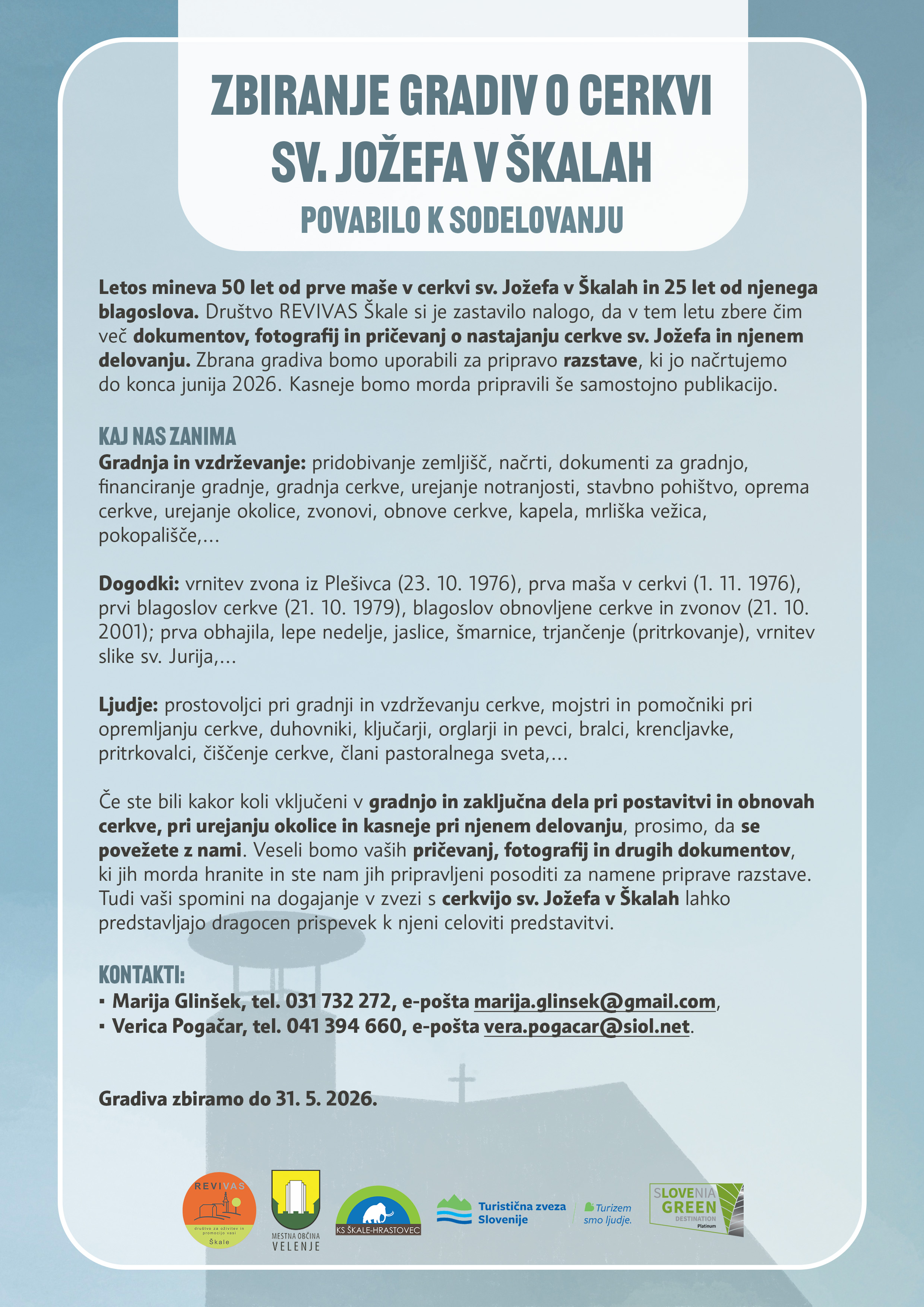 Letos mineva 50 let od prve maše v cerkvi sv. Jožefa v Škalah (1. 11. 1976) in 25 let od blagoslova obnovljene cerkve in zvonov (21. 10. 2001). Društvo REVIVAS Škale si je zastavilo nalogo, da v tem letu zbere čim več dokumentov, fotografij in pričevanj o nastajanju cerkve sv. Jožefa in njenem delovanju. Zbrana gradiva bomo uporabili za pripravo razstave, ki jo načrtujemo do konca junija 2026.