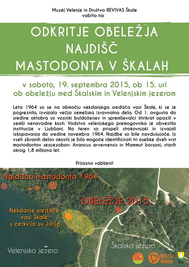 - V soboto, 19. 9. 2015 ob 15. uri bomo med Škalskim in Velenjskim jezerom odkrili OBELEŽJE NAJDIŠČ MASTODONTA.