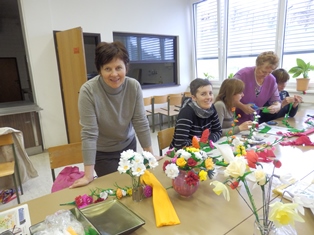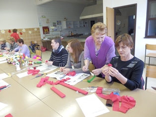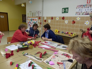 V četrtek, 27. marca 2014 smo organizirali delavnico izdelave rož iz krep papirja. Eden od namenov delavnice je bil evidentirati izdelovalke za vpis v register žive kulturne dediščine. Odziva smo bili veseli, saj so se nam pridružile Milena Blažič, Hedvika Cerkovnik, Angela Jan, Lojzka Ocepek in Marija Pušnik ter še nekatere mojstrice, ki so na začetku sicer potožile, da so "iz vaje", a že po nekaj minutah so lahko tudi one ostalim prisotnim, med katerimi je bilo tudi precej začetnic, pomagale in delile nasvete. Poskusili smo narediti nekaj enostavnejših rožic iz bogatega nabora predstavljenih. Vsi skupaj pa smo se potem lotili še izdelave nageljčkov in v slabih treh urah je nastalo lepo število izdelkov.