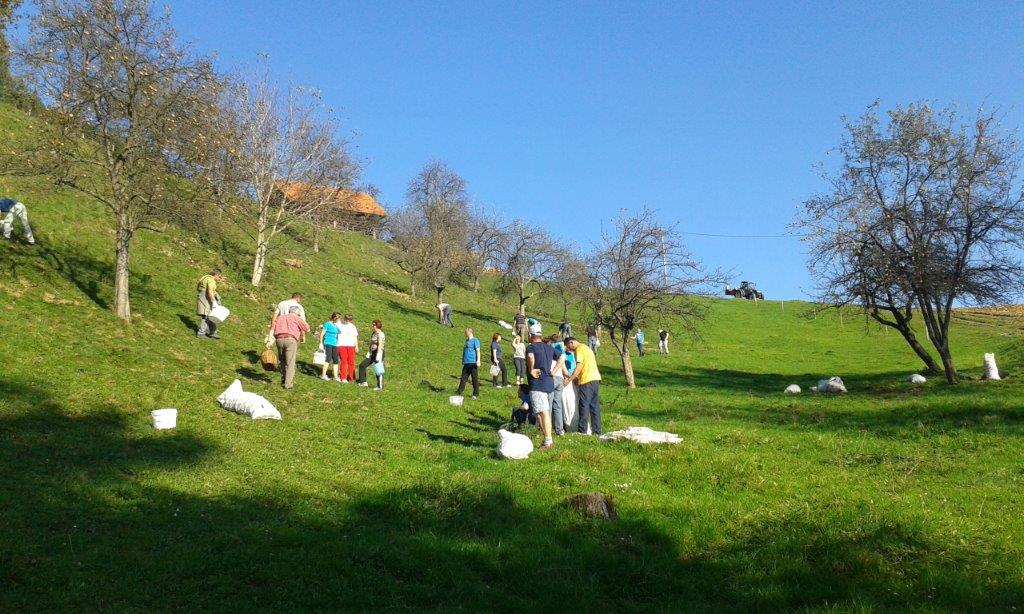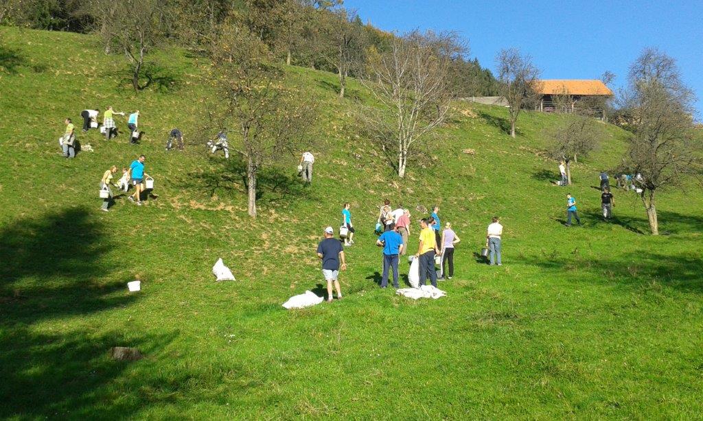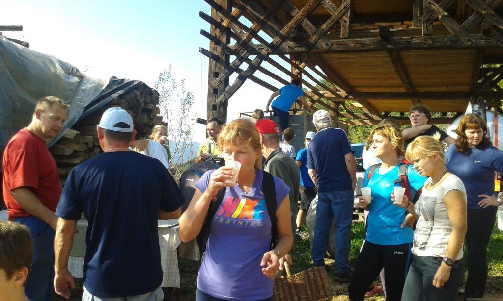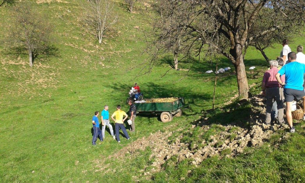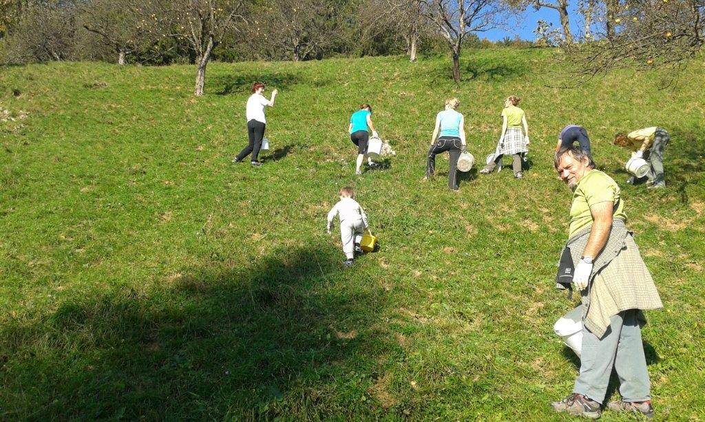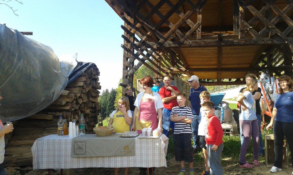 Pri 150 let starem Strževem kozolcu nas je pričakala nasmejana Darja Miklavžina, mlada kmetica leta 2014, s svojo družino. Po uvodnem pozdravu in okrepčilu so nas Strževi razdelili po skupinah – tri za pobiranje sadja in ena za luščenje fižola. Debeli dve uri je potekalo delo, večinoma v precej strmih sadovnjakih. Tu je še posebej prav prišla pomoč številčno in tudi fizično najmočnejših udeležencev, planincev PD Škale-Hrastovec, vajenih takšnih terenov, predvsem pa vedno dobre volje in pripravljenih poprijeti za delo.