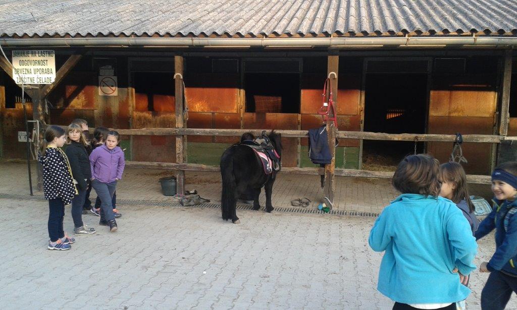 Pri konjereji so nas ljubeznivo sprejela štiri dekleta, ki so nas razdelila v skupine, nato pa izmenično popeljala na ogled štal in na spoznavanje s ponijem. Povedala so nam veliko zanimivosti o negi in vzreji konj ter seveda o tem, kako opremiti konja in sebe ter kako zlesti na konjev hrbet in na njem obstati. Poni Bači je potrpežljivo dovolil vsakemu, da je to tudi v praksi preskusil. Nekateri so vmesni čas izkoristili tudi za rezanje »duhcev« iz majhnih bučk. Preden smo se poslovili, pa je vseh 17 otrok v spomin na prvi letošnji izlet in obisk Konjereje Skaza prejelo pravo podkev - za srečo!