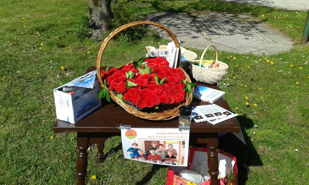 Naše društvo je že tretje leto zapored obiskovalcem delilo nageljčke, ki so jih izdelale prizadevne članice sekcije izdelovalk rož iz krep papirja. Pripravile so jih preko 150, a jih je vseeno zmanjkalo. Kot vsako leto smo poskrbeli tudi za animacijo obiskovalcev. Tokrat smo jih spraševali o knjigah. Pred tednom dni, 23. aprila, smo namreč obeležili svetovni dan knjige in 400-letnico smrti dveh pomembnih književnikov, Shakespeara in Cervantesa.