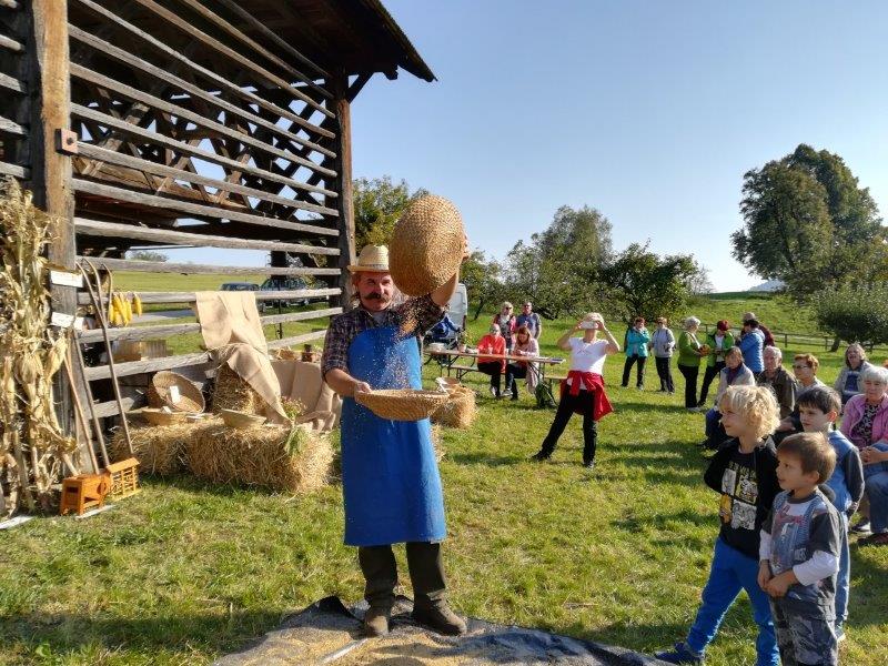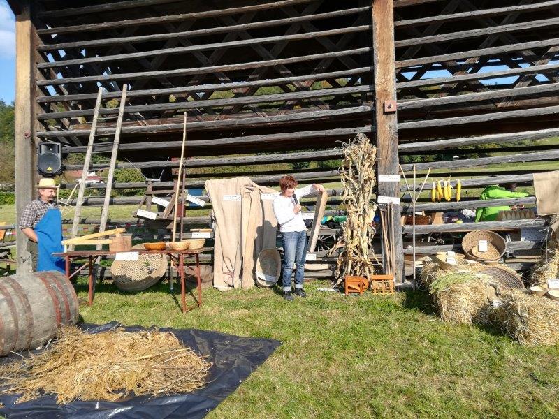 V nedeljo, 1. oktobra, popoldne je društvo REVIVAS Škale pri Kelherjevem kozolcu v Škalah pripravilo tradicionalno etnološko zabavno prireditev JESEN NA VASI. Razstavo pridelkov je dopolnila še tematska razstava žit in orodij za spravilo žit. Semena avtohtonih vrst žit je društvo delilo obiskovalcem že na Jožefovem sejmu, 19. marca, in nato na različnih predstavitvah od Gornje Radgone do Velenja. Ideja je bila, da semena posadijo oziroma posejejo in del pridelka prinesejo jeseni na razstavo. Pridelovalcev žit se sicer ni pojavilo veliko, a razstava je vseeno dobro uspela, saj je večina prinesla več sort žit. Za lepe aranžmaje, ki so prav žareli v prijetnem sončnem popoldnevu , sta poskrbeli Marija in Ana Glinšek. Paša za oči je bila tudi razstava orodij za spravilo žit, večinoma takšnih, ki jih na njivah in kmetijah le še redko uporabljajo, saj so večino del nadomestili stroji. Videti je bilo vse od srpov do trlic in stop. Za nazoren prikaz mlačve, ličkanja koruze in spravila prosa so poskrbeli Jože Hudournik, Branko Špital in Ivan Krenker. V posameznih opravilih so se preskusili še obiskovalci, uživali so tudi otroci. Stane Vovk, ki je povezoval program, je povedal marsikaj zanimivega o žitih, orodjih in opravilih, svoje pa so dodali tudi obiskovalci, ki so se spominjali, kako so delali nekoč. Eva Kumer in Olga Janžovnik sta za otroke pripravili posebne igre in delavnico, v kateri so ustvarjali s semeni.