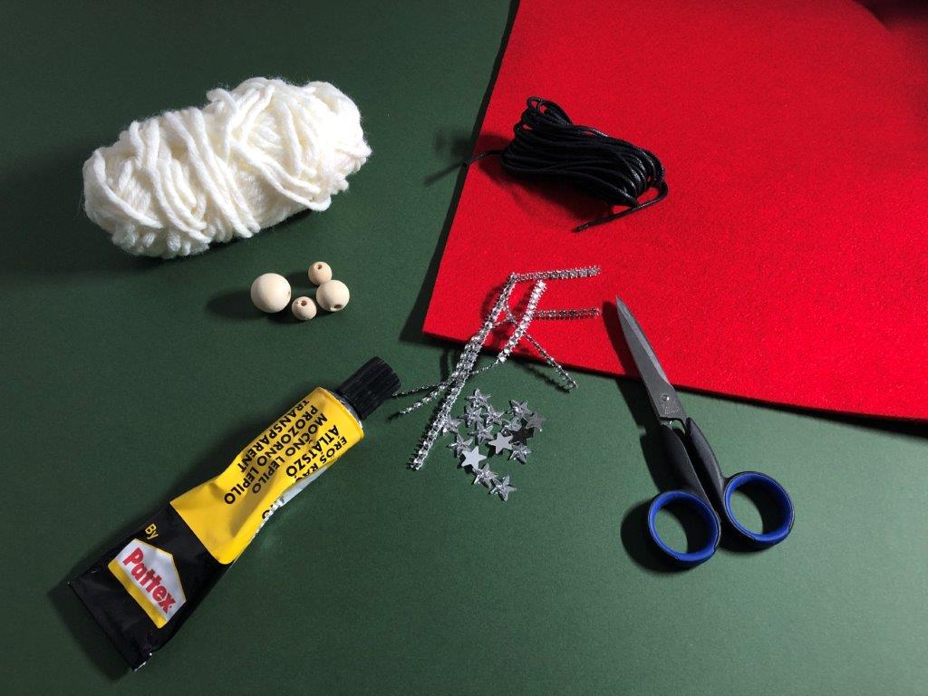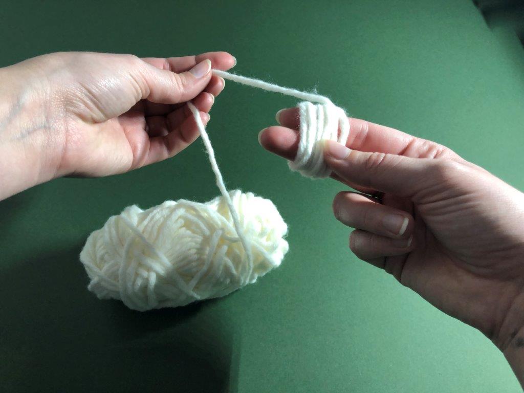 Škratek najprej potrebuje svojo bradico. Volno željene barve si ovijemo okrog palca in kazalca približno 40 x, zvitek na sredini trdno zavežemo in s škarjami prerežemo zanke, da dobimo majhen cofek. Po želji cofek še »sfriziramo«.