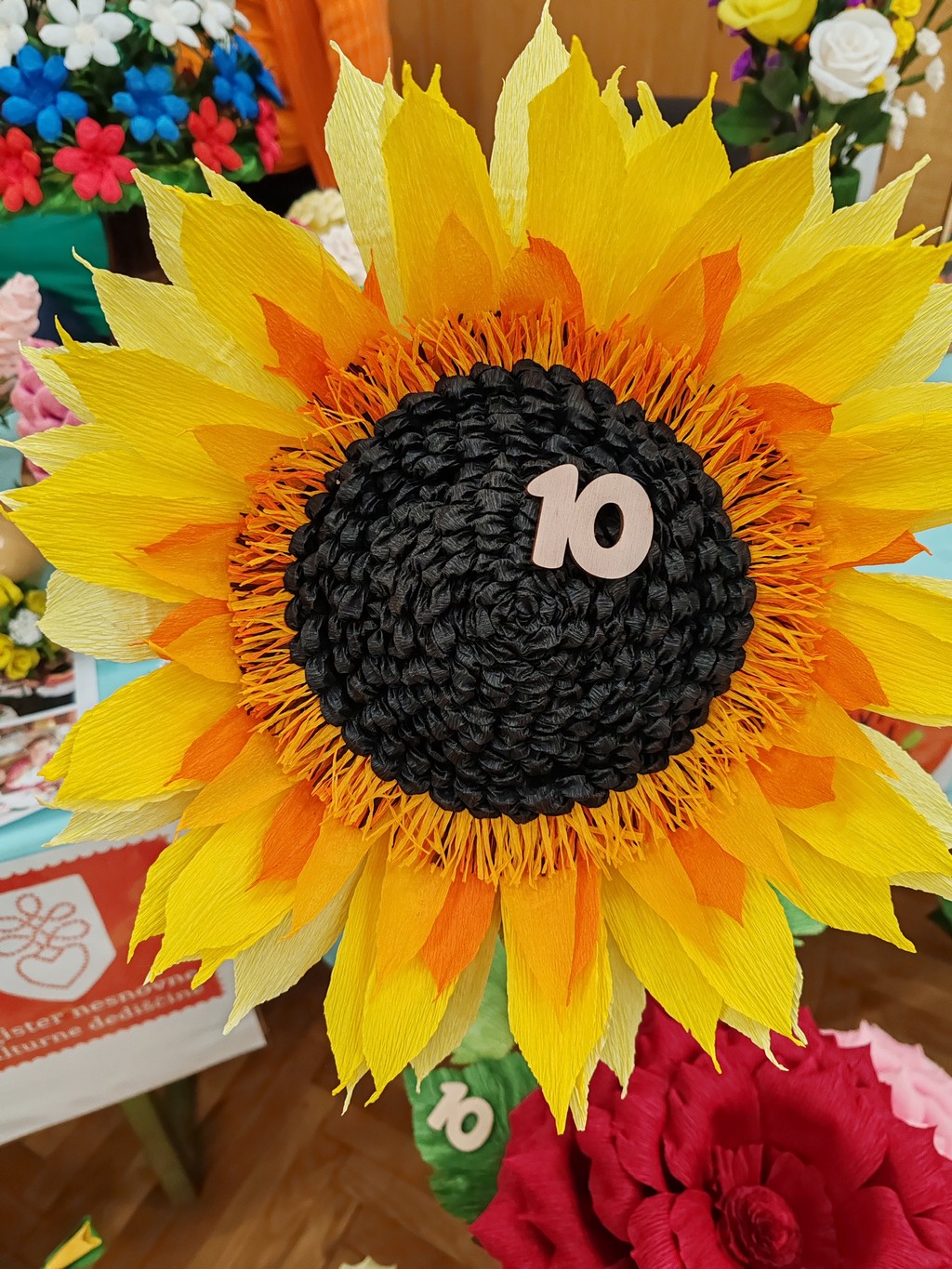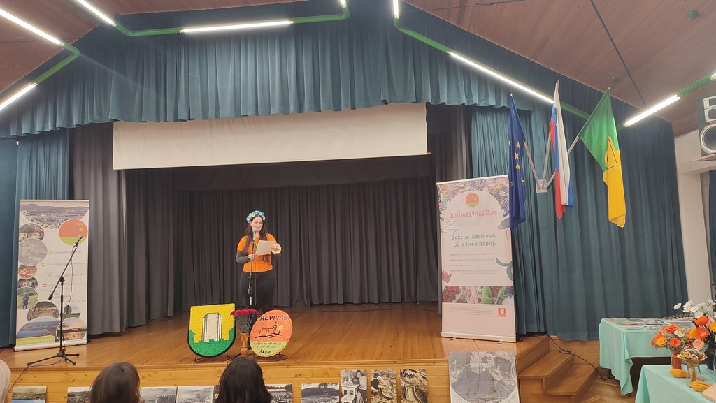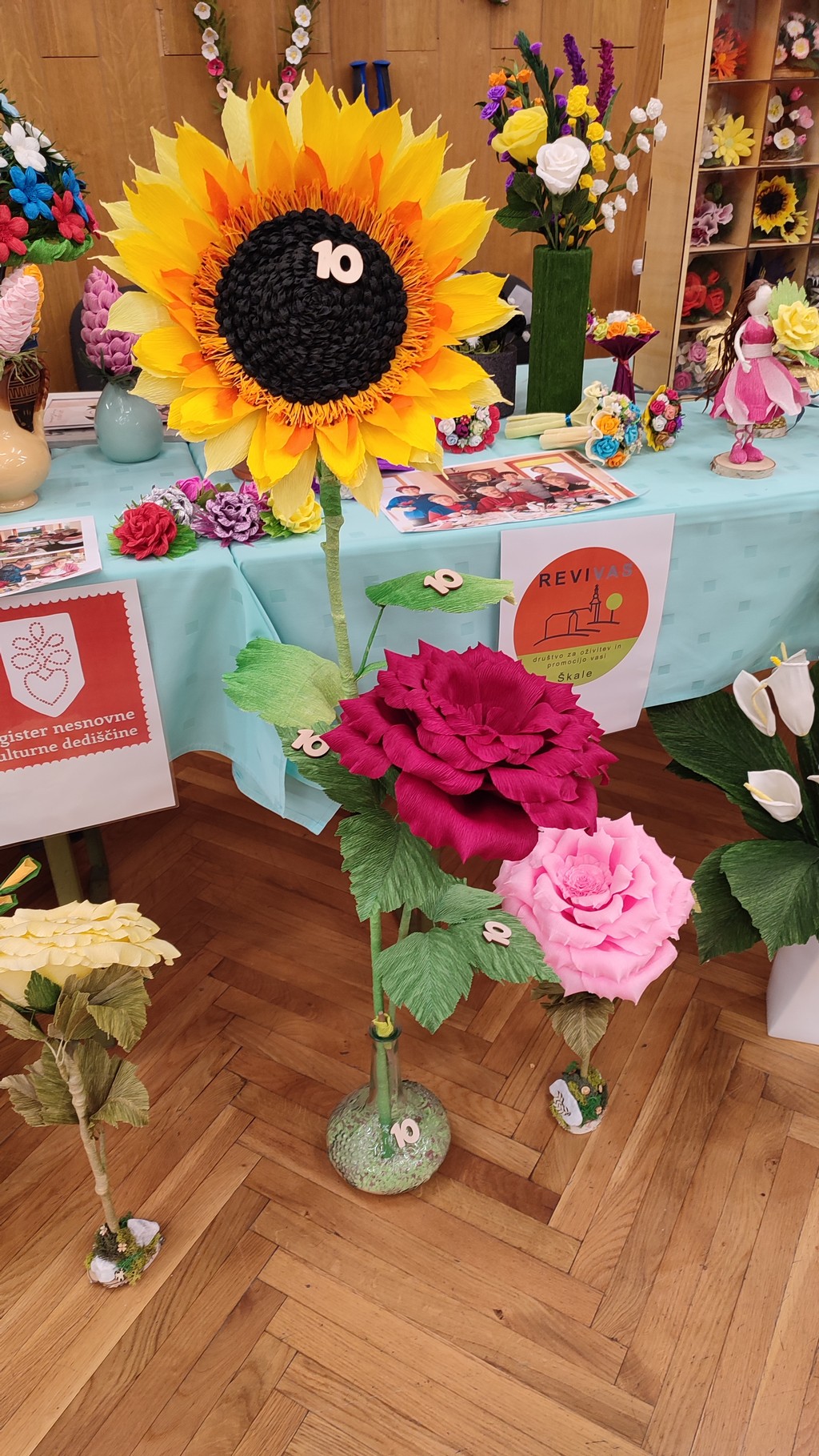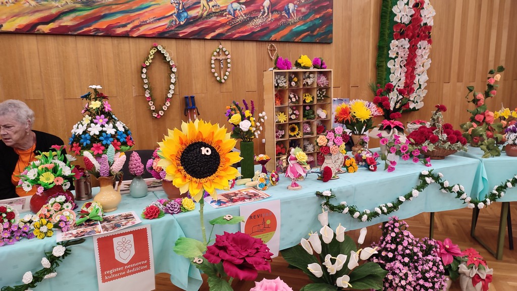 Letos mineva 10 let, odkar je društvo REVIVAS Škale vpisano v register nesnovne kulturne dediščine kot nosilec izdelovanja papirnatih rož in nosilec izdelovanja cvetnonedeljskih butar (snopov). Sekcija izdelovalk rož iz krep papirja je v tem letu intenzivno promovirala svojo dejavnost preko delavnic in predstavitev na tematskih razstavah in različnih dogodkih v občini in izven nje. Z razstavo rož iz krep papirja v domačem kraju pod naslovom ROŽICE ZA 10 pa je, skupaj z društvi, ki redno organizirajo takšne razstave, obeležila 10. obletnico dela. V dvorani KS v gasilskem domu Škale so se poleg naših članic sekcije izdelovalk rož iz krep papirja s svojimi izdelki predstavile še Vranske rož'ce, Turistično društvo Breza Pragersko-Gaj, Turistično društvo Tuhinjska dolina, Turistično društvo Dobrna ter Društvo podeželskih žena občine Žalec. Dvorana je bila skoraj premajhna za vse rožice, ki so jih izdelale njihove pridne in spretne roke. Cvetje vseh barv in oblik je žarelo in privabljalo poglede vseh prisotnih. Razstavo si je ogledal tudi Peter Dermol, župan Mestne občine Velenje.