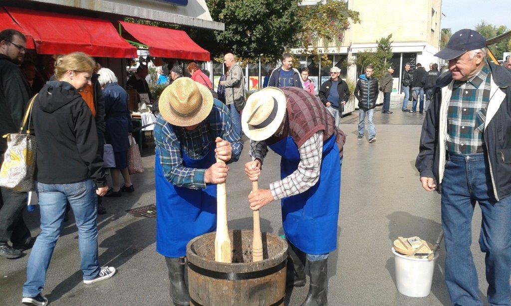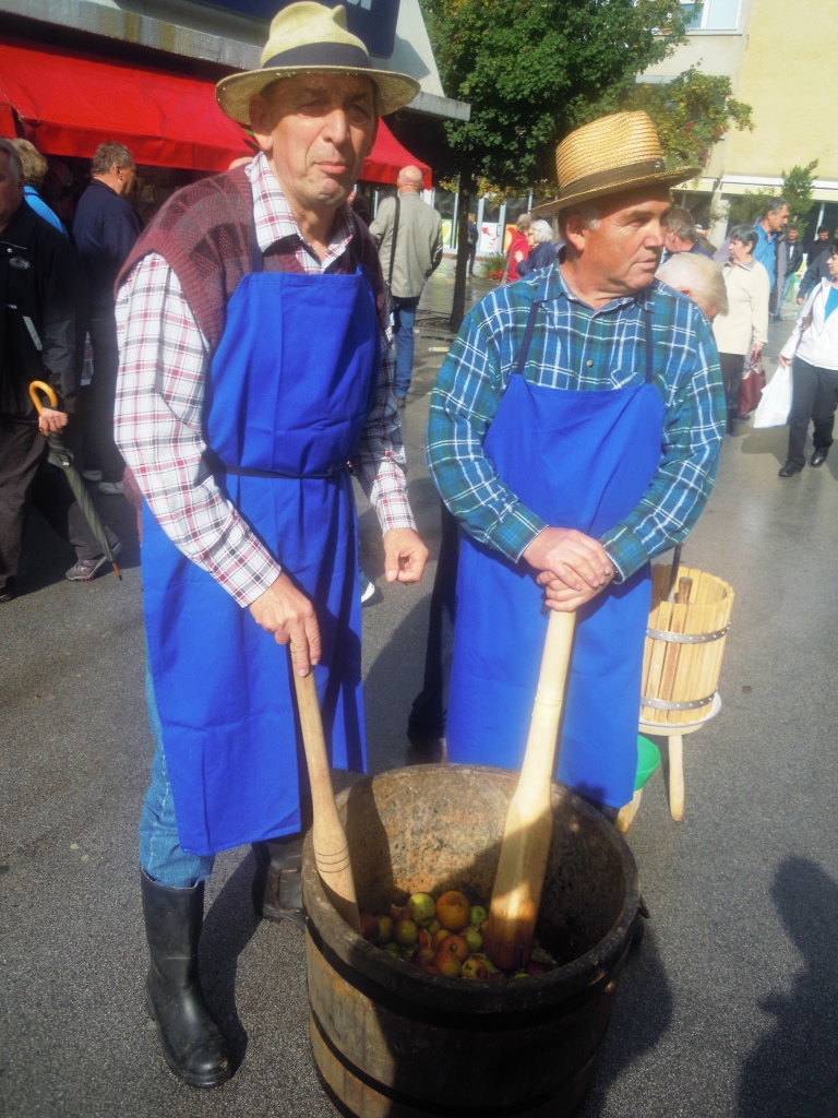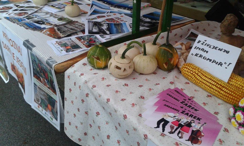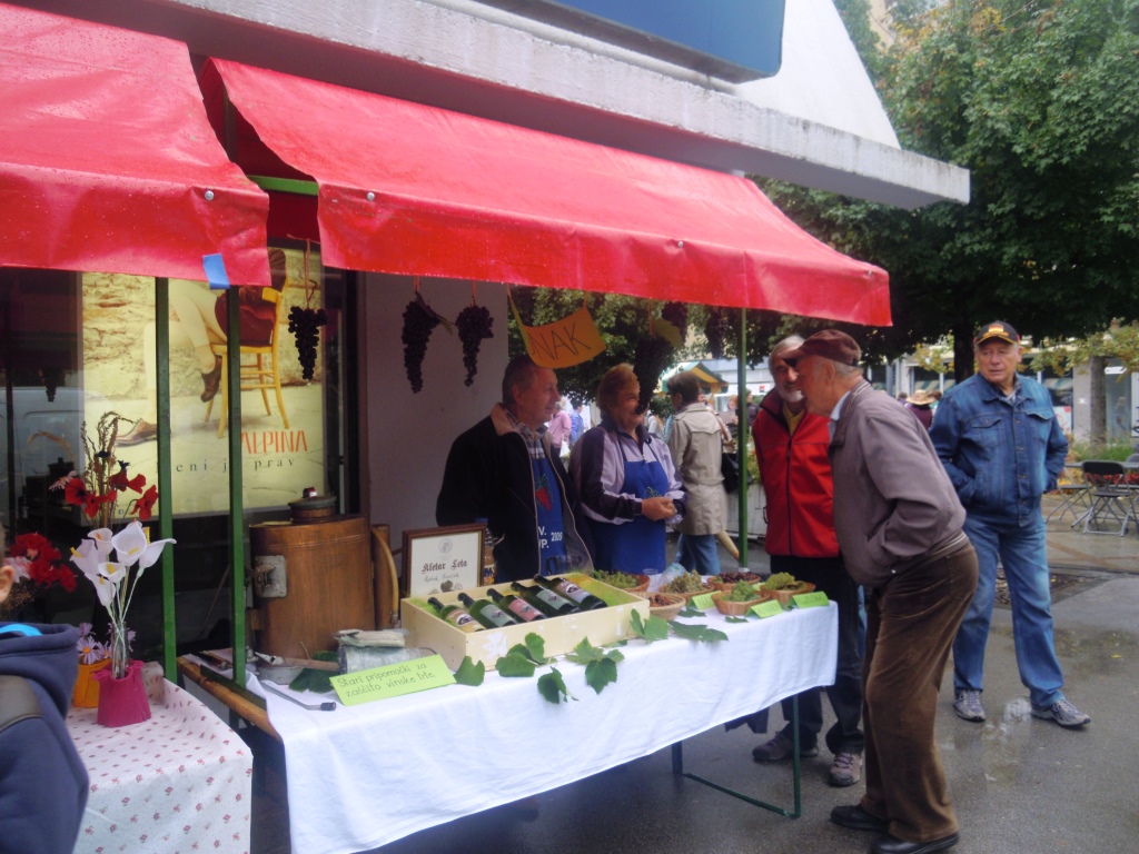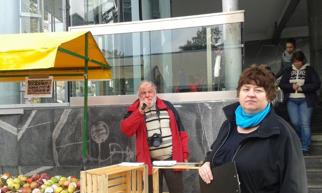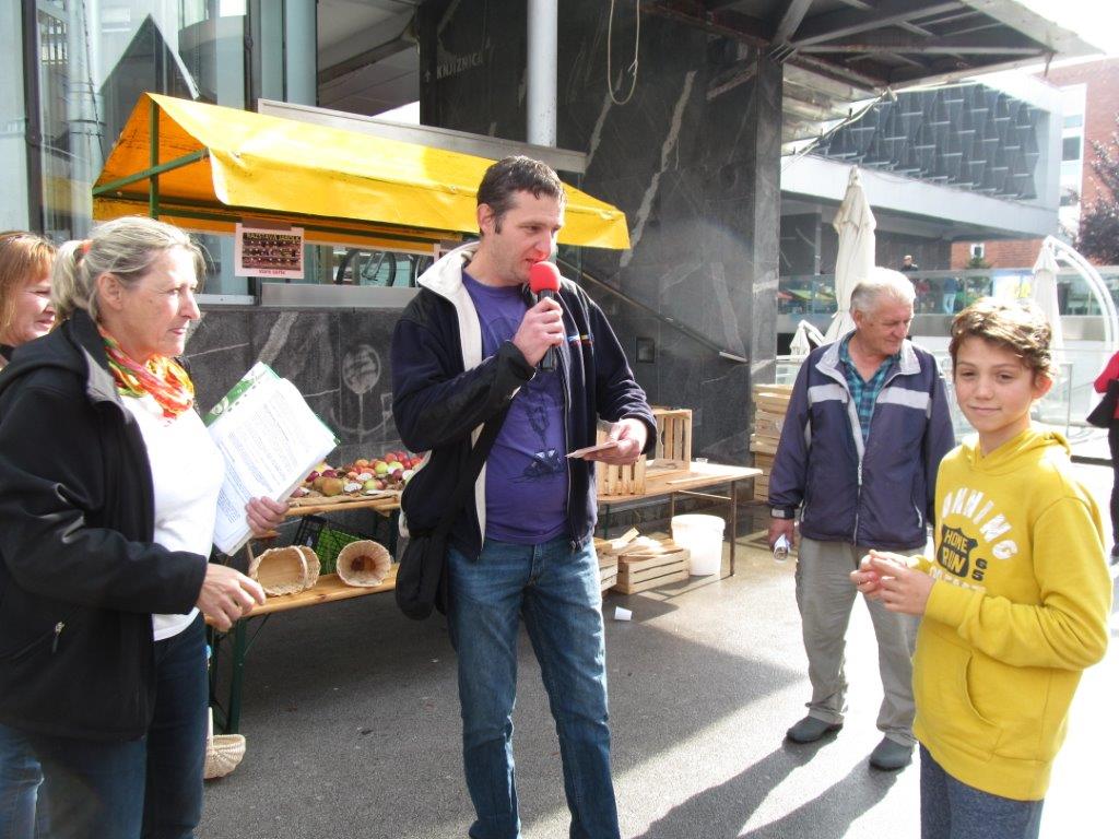 Prva letošnja oktobrska sobota je bila bolj podobna aprilski - vsaj kar se vremena tiče. Ob robu jesenskega sejma, ki se je odvijal na Cankarjevi ulici, smo pred Centrom Nova pripravili zelo zanimiv program. Jutranje plohe so žal kmalu začele umivati pridelke na naši razstavi, ki jo je postavil Oskar Sovinc s pomočjo rekvizitov lokalnih ponudnikov in članov društva. Vsaka je za nekaj minut pregnala obiskovalce, ki so si z zanimanjem ogledovali tako razstavo pridelkov kot tudi razstavo različnih sort jabolk in ponudbo na naših stojnicah.