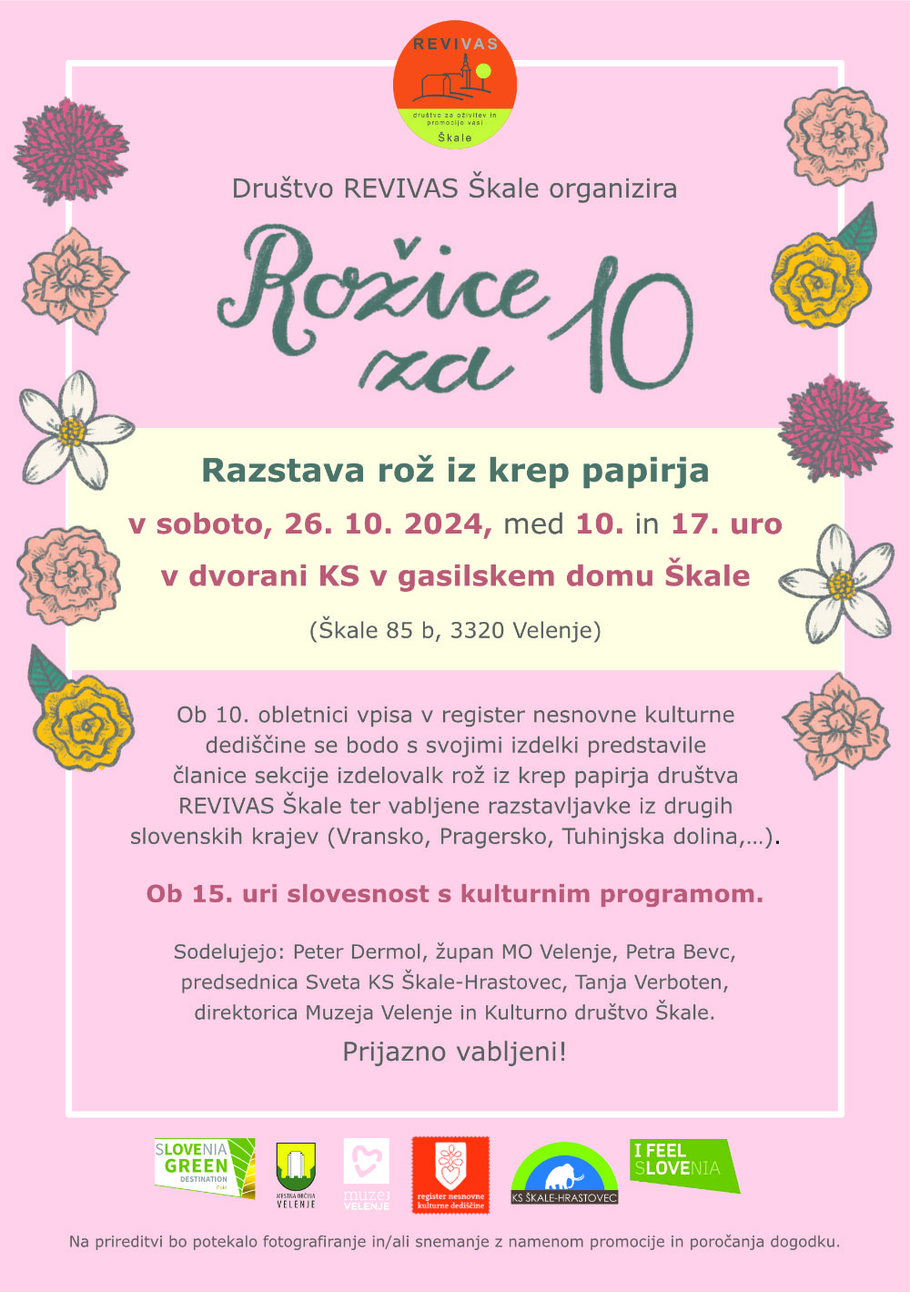Letos mineva 10 let, odkar je društvo REVIVAS Škale vpisano v register nesnovne kulturne dediščine kot nosilec izdelovanja papirnatih rož in nosilec izdelovanja cvetnonedeljskih butar (snopov). Sekcija izdelovalk rož iz krep papirja je v tem letu intenzivno promovirala svojo dejavnost preko delavnic in predstavitev na tematskih razstavah in različnih dogodkih v občini in izven nje. Z razstavo rož iz krep papirja v domačem kraju pod naslovom ROŽICE ZA 10 pa je, skupaj z društvi, ki redno organizirajo takšne razstave, obeležila 10. obletnico dela. V dvorani KS v gasilskem domu Škale so se poleg naših članic sekcije izdelovalk rož iz krep papirja s svojimi izdelki predstavile še Vranske rož'ce, Turistično društvo Breza Pragersko-Gaj, Turistično društvo Tuhinjska dolina, Turistično društvo Dobrna ter Društvo podeželskih žena občine Žalec. Dvorana je bila skoraj premajhna za vse rožice, ki so jih izdelale njihove pridne in spretne roke. Cvetje vseh barv in oblik je žarelo in privabljalo poglede vseh prisotnih. Razstavo si je ogledal tudi Peter Dermol, župan Mestne občine Velenje.