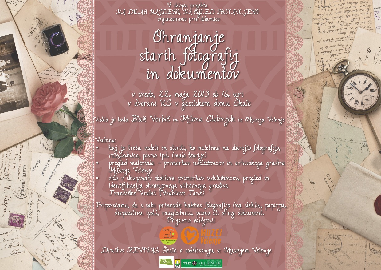 Tudi v letu 2013 bo društvo REVIVAS Škale del svojih aktivnosti posvetilo izobraževanju o ohranjanju dediščine ter zbiranju gradiv. V sklopu projekta NA DILAH NAJDENO, NA OGLED POSTAVLJENO, bomo v sodelovanju z Muzejem Velenje organizirali dve delavnici za člane in ostalo zainteresirano javnost:
