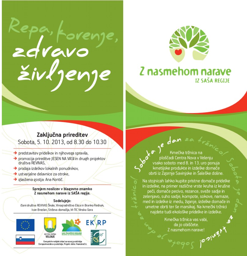 V soboto, 5. oktobra 2013 med 8.30 in 11.30 se društvo REVIVAS predstavlja na kmečki tržnici v Velenju (pred Centrom Nova). Na prireditvi z zgovornim naslovom REPA, KORENJE, ZDRAVO ŽIVLJENJE bomo pripravili manjšo razstavo pridelkov in promocijo naših projektov, predstavili pa se bodo tudi Vinogradništvo Elica in Branko Rednak, Ivan Brezlan in Strževa domačija. Z ustvarjalnimi delavnicami bo sodeloval M-TIC Vinska Gora, za še boljše vzdušje pa bo s harmoniko poskrbela Ana Kontič.