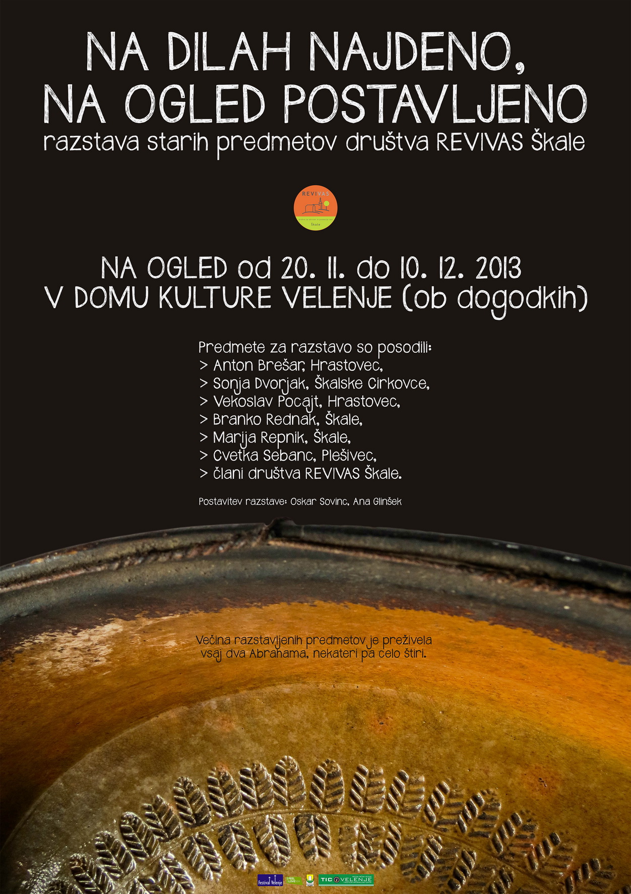 Projekt NA DILAH NAJDENO, NA OGLED POSTAVLJENO, v sklopu katerega smo letos izvedli dve delavnici in nekaj predstavitev starin, zaključujemo z razstavo starih predmetov v zgornji in spodnji avli Doma kulture v Velenju. Postavila sta jo Oskar Sovinc in Ana Glinšek, predmete zanjo pa so posodili člani društva REVIVAS ter posamezniki iz Cirkovc, Hrastovca, Plešivca in Škal. Ogledate si jo lahko ob dogodkih, ki se v Domu kulture odvijajo med 20. 11. in 10. 12. 2013, in sicer: