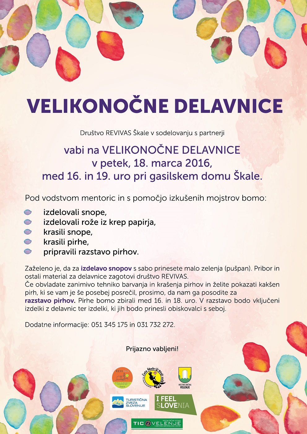 · v petek, 18. marca 2016, popoldne (med 16. in 19. uro) bomo pri gasilskem domu Škale na velikonočnih delavnicah izdelovali in krasili snope, krasili pirhe ter pripravili razstavo pirhov.