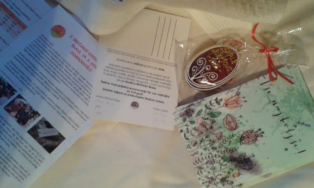 Na stojnici je bilo mogoče dobiti tudi voščilnico za Jožice in Jožete, ki sta jo poleg društva REVIVAS podpisala Strašna Jožeta, Jože Krajnc in Jože Robida. V sklopu projekta »V pričakovanju velike noči« smo namreč od konca januarja do 12. marca zbirali naslove Jožic in Jožetov, ki godujejo 19. marca. Z akcijo smo začeli na sejmu NATOUR v Ljubljani, za zbiranje pa izkoristili še predstavitve v Mercator centrih v Celju in Mariboru ter dogodke v kraju in občini. V tednu pred Jožefovim smo na zbrane naslove razposlali preko 400 voščilnic s posebnim posvetilom in podpisom predstavnic društva in Strašnih Jožetov. Godovniki iz naše krajevne skupnosti, ki smo jim dodali še 10 povabljencev od drugod, so prejeli tudi posebno vabilo na 2. srečanje godovnikov v Škalah. Tega smo pripravili prav na Jožefovo, 19. marca 2016, popoldne.