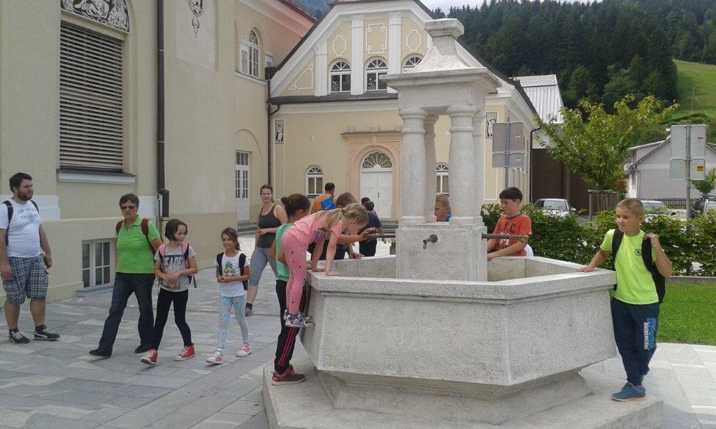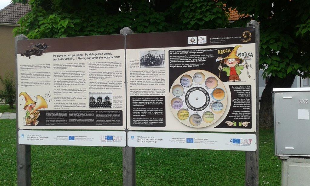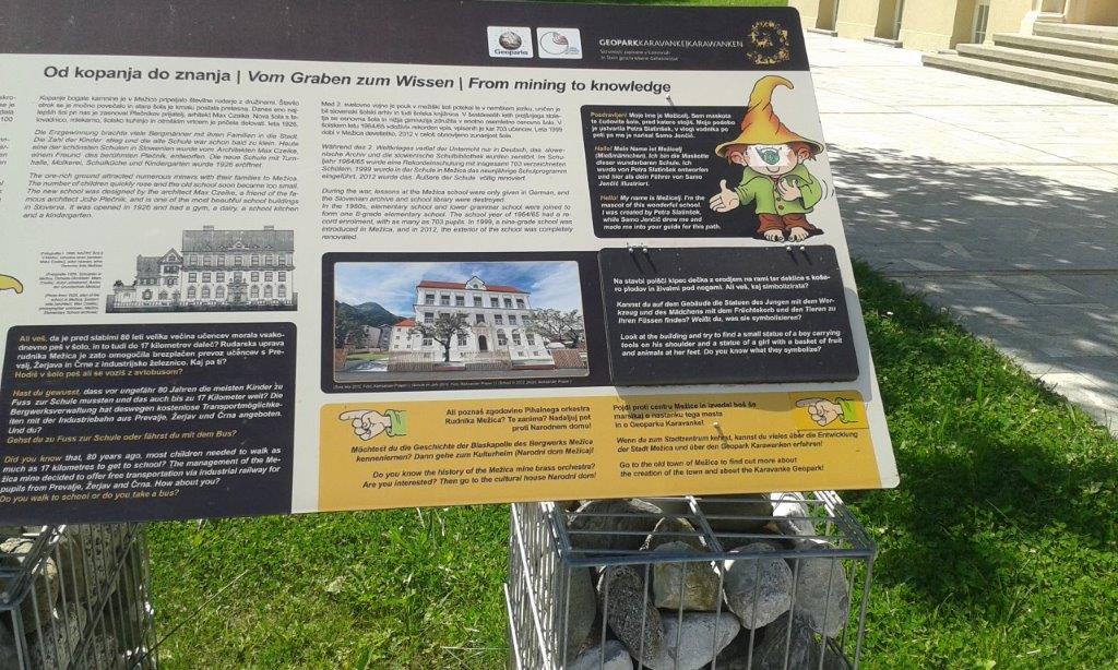 Naš naslednji postanek je bil v središču Mežice, pred glavno upravno stavbo, kjer se začne Geološka pohodna učna pot Mežica (v sklopu Geoparka Karavanke). Z g. Jožetom Hrastnikom smo prehodili prve štiri postaje ter si ogledali spomenik rudarjem, Bargetovo vilo s potomko najstarejše vinske trte, impozantno osnovno šolo in njeno okolico s spomenikom Vinku Möderndorferju ter spominski park pred Narodnim domom. Na tej poti smo spoznali Mežiclja, glavna rudna minerala sfalerit in galenit ter nekaj koroških knapovskih izrazov.