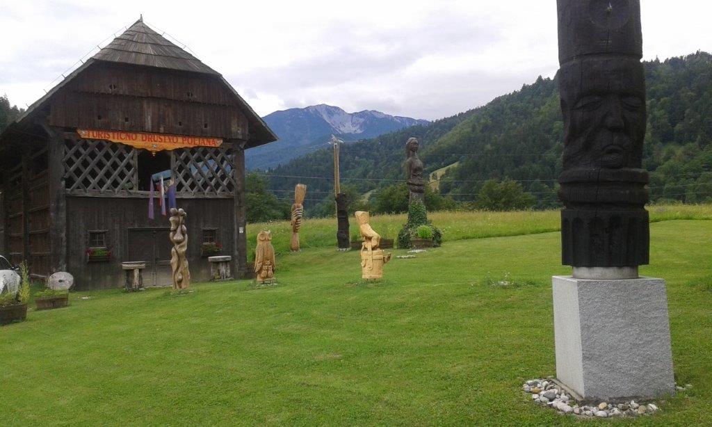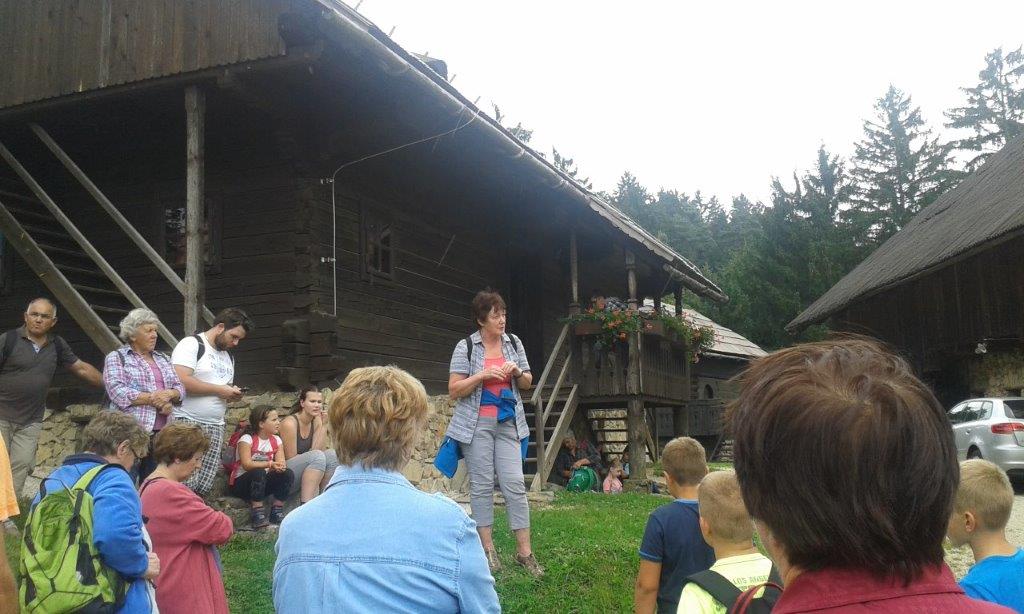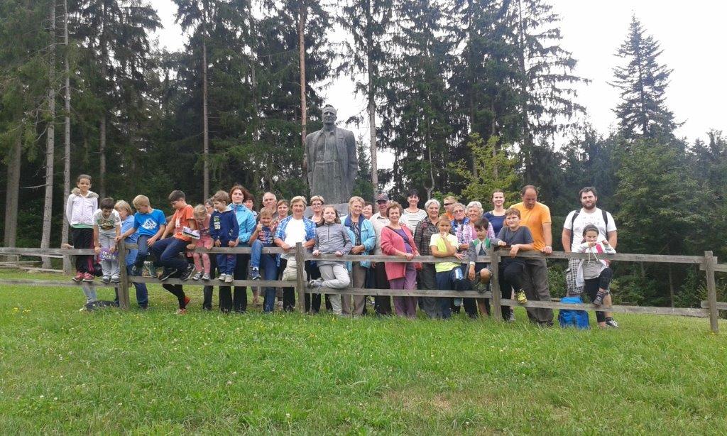 Pot smo nadaljevali mimo Prevalj in Raven na Koroškem do Kotelj. Večina se nas je odpravila peš po delu Vorančeve poti na Preški vrh do Prežihove bajte - spominskega muzeja Prežihovega Voranca. Pred ogledom muzeja nam je Anica predstavila življenje in delo Lovra Kuharja - Prežihovega Voranca, ki je za večino svojih literarnih del črpal zgodbe iz svojih rodnih Kotelj in okoliških krajev. Nato smo se povzpeli še do njegovega spomenika nad domačijo, kjer sta nam Anica in mladi turist Jure prebrala njegovo črtico Solzice.