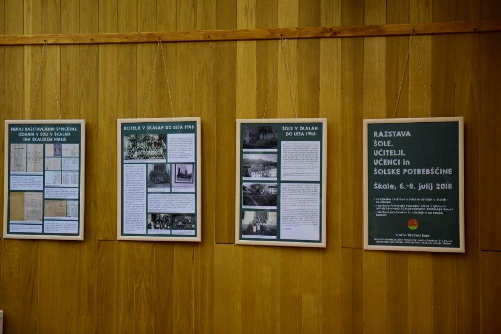 Po zaključku okrogle mize, ki jo je z glasbenimi vložki obogatil še mojster diatonične harmonike Nejc Pačnik, je sledila predstavitev vsebine in odprtje razstave Šole, učitelji, učenci in šolski pripomočki. Društvo REVIVAS Škale je to razstavo pripravilo ob 70. obletnici izpraznitve šol v prvem središču vasi ter 30. obletnici porušenja šole v drugem središču. Pregledna razstava o šolah in učiteljih je predstavila zgodovino šolstva in šolskih stavb v Škalah ter pregled učiteljev, ki so poučevali v Škalah do leta 1988, pa tudi življenje na šoli. Preko 50 fotografij učencev z njihovimi učitelji je prikazovalo različne generacije otrok, ki so obiskovali šole v Škalah do leta 1987. Poseben del razstave so bili eksponati - šolski pripomočki: od šolskih klopi do tablic, lesenih peresnic, črnilnikov, knjig, zvezkov, učiteljskih dnevnikov in testov, do pohval, priznanj, značk in pionirskih izkaznic. Posebej zanimiva pa je bila zbirka spričeval, od najstarejšega z letnico 1905 do tistih tik pred in takoj po vojni.