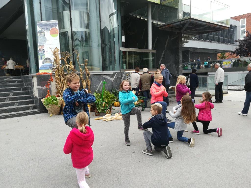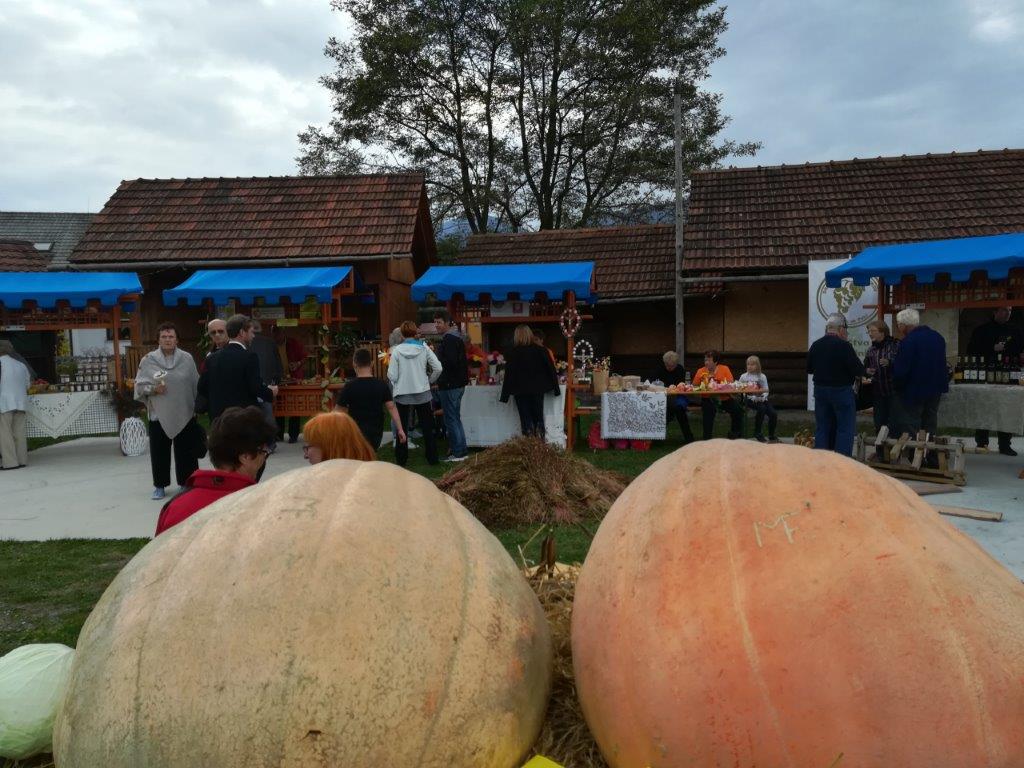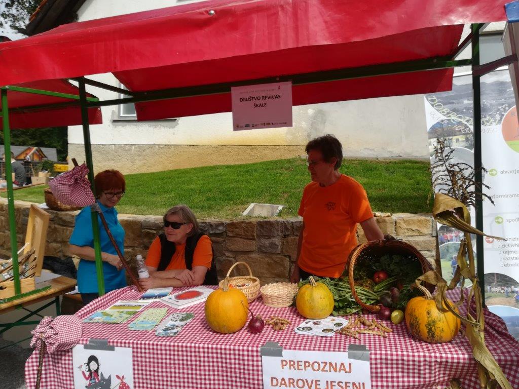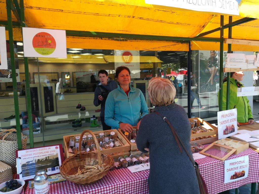 Dopoldne smo izvedli tradicionalno predstavitev jesenskih pridelkov na mestni tržnici (v okviru TZ Velenje). Pripravili smo razstavo pridelkov, razstavo semen fižola in receptov za jedi iz fižola. Na stojnicah sta se predstavili tudi Marijana Turinek s fižolom in Marija Hranjec z izdelki iz koruznega ličja. Mladi turisti in učenci šole Škale so pripravili glasbeno plesni nastop, Natalia Jakop je zaigrala na harmoniko, Saška Miklavžina pa je zapela nekaj pesmi. Predstavitev v Velenju smo izkoristili za promocijo prihajajočih dogodkov (delavnic pletenja iz koruznega ličja in adventnih delavnic v novembru ter Jožefovega sejma v marcu prihodnje leto) in učne poti okoli Škalskega jezera.