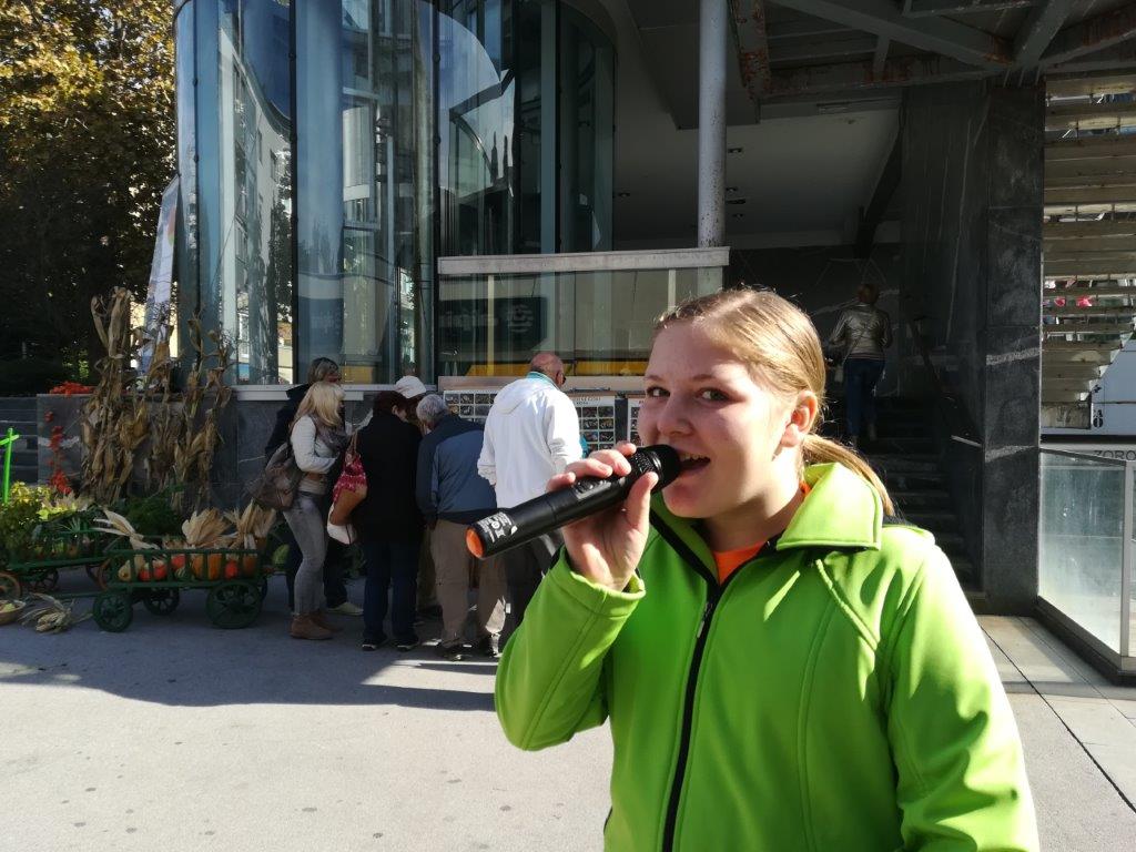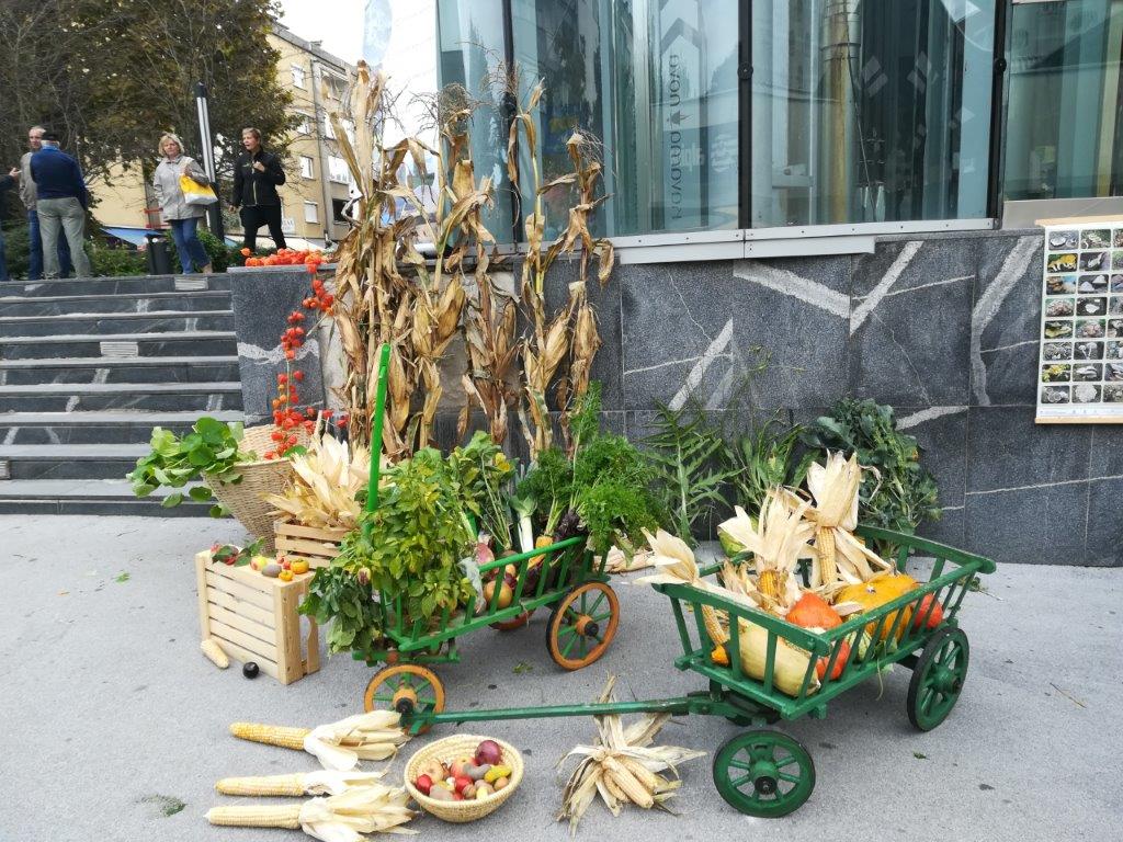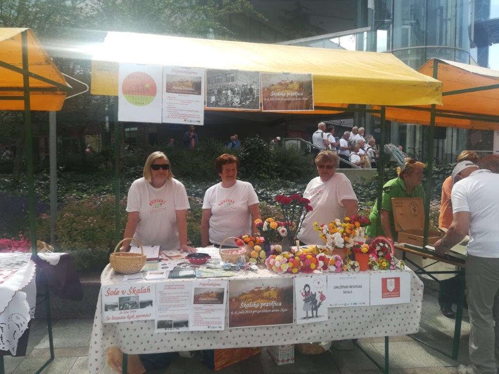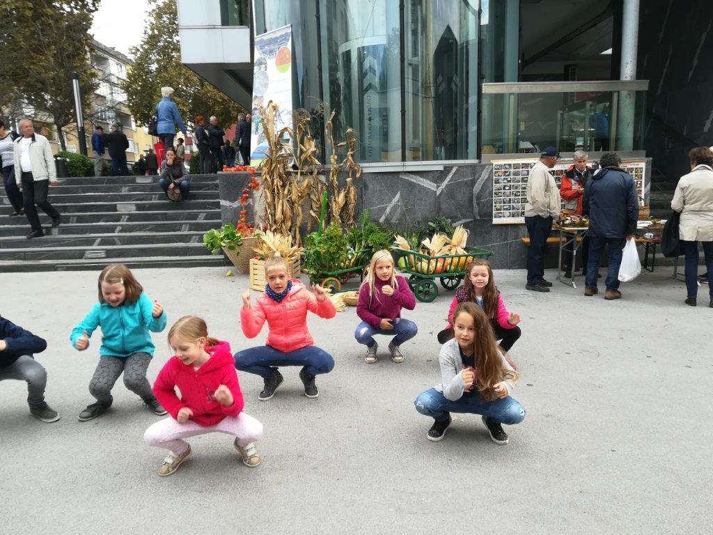 Dopoldne smo izvedli tradicionalno predstavitev jesenskih pridelkov na mestni tržnici (v okviru TZ Velenje). Pripravili smo razstavo pridelkov, razstavo semen fižola in receptov za jedi iz fižola. Na stojnicah sta se predstavili tudi Marijana Turinek s fižolom in Marija Hranjec z izdelki iz koruznega ličja. Mladi turisti in učenci šole Škale so pripravili glasbeno plesni nastop, Natalia Jakop je zaigrala na harmoniko, Saška Miklavžina pa je zapela nekaj pesmi. Predstavitev v Velenju smo izkoristili za promocijo prihajajočih dogodkov (delavnic pletenja iz koruznega ličja in adventnih delavnic v novembru ter Jožefovega sejma v marcu prihodnje leto) in učne poti okoli Škalskega jezera.