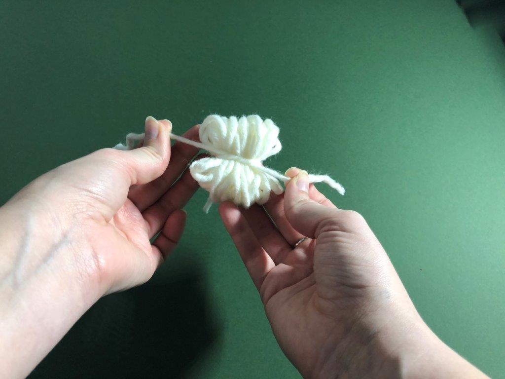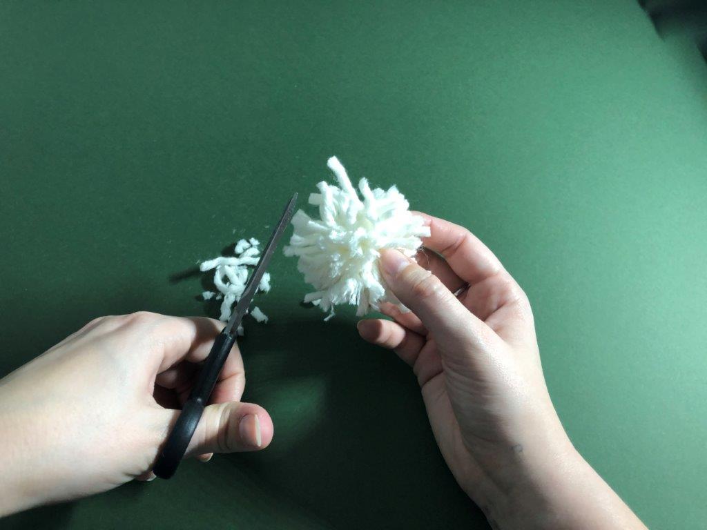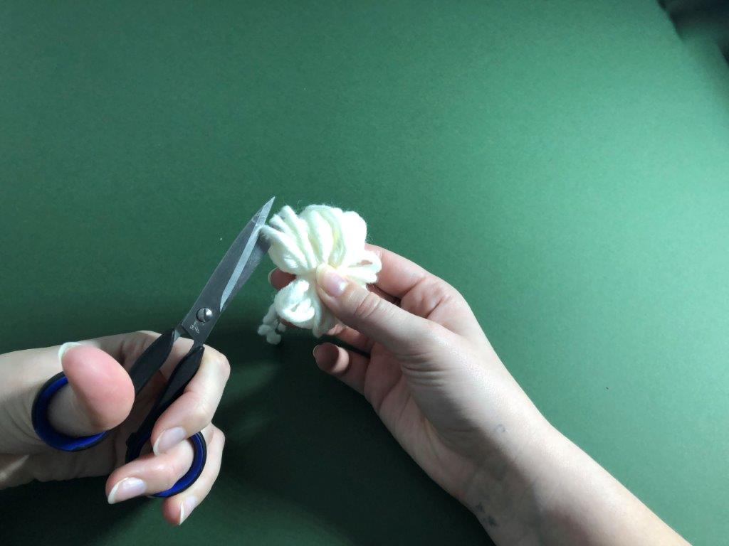 Škratek najprej potrebuje svojo bradico. Volno željene barve si ovijemo okrog palca in kazalca približno 40 x, zvitek na sredini trdno zavežemo in s škarjami prerežemo zanke, da dobimo majhen cofek. Po želji cofek še »sfriziramo«.