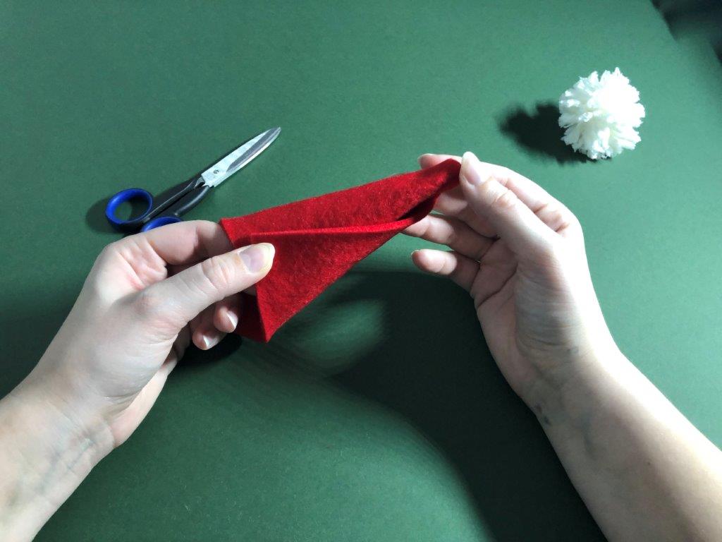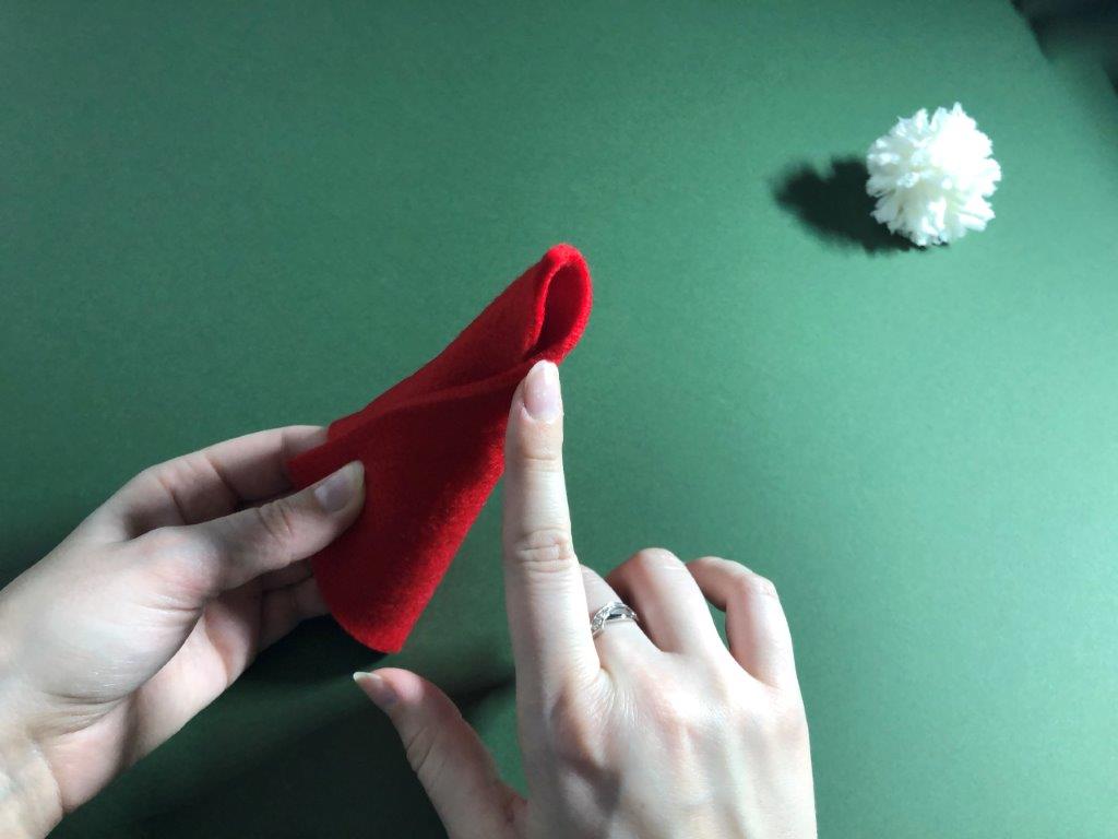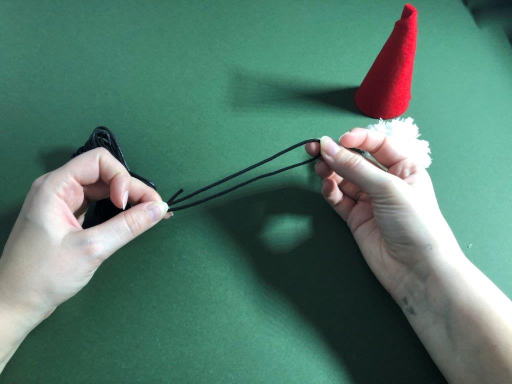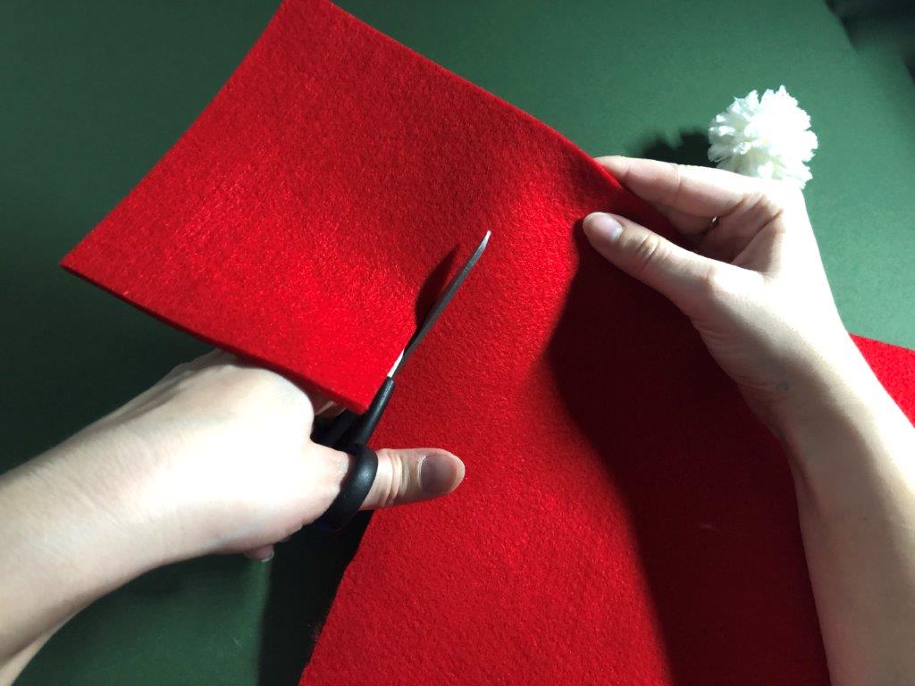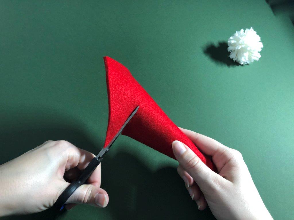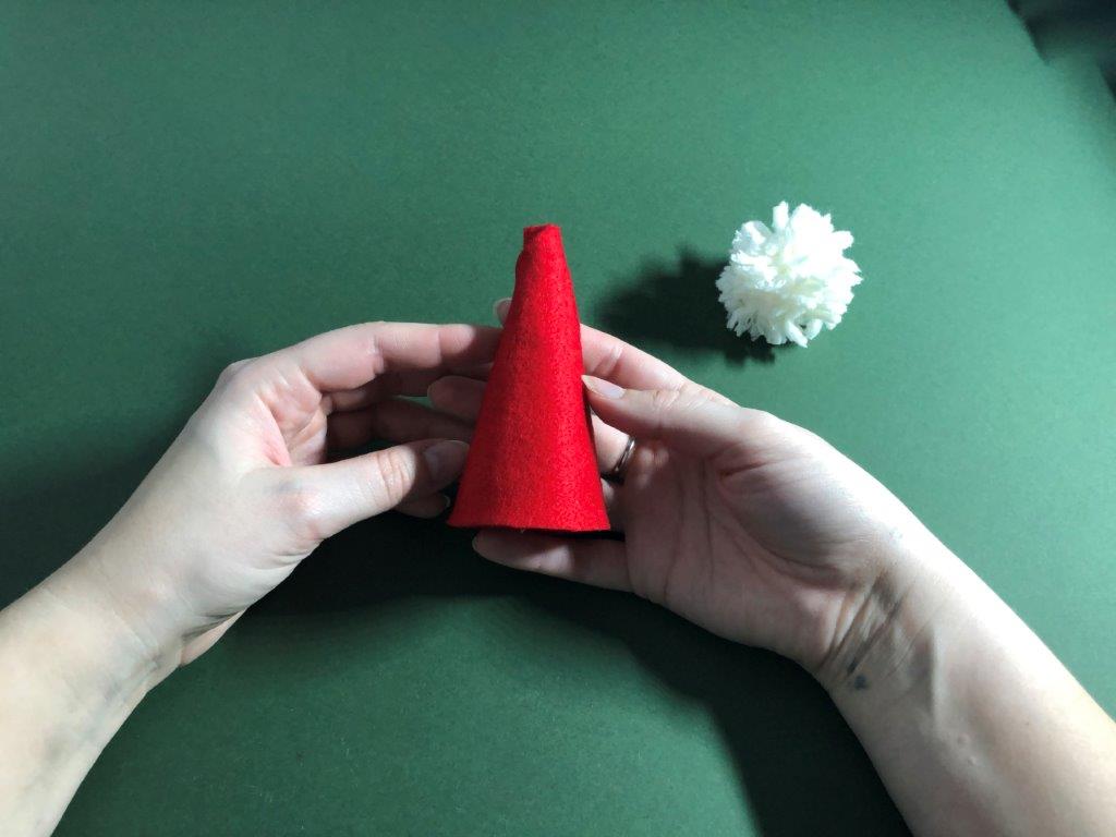 Nadaljujemo s škratovsko kapo. Iz filca odrežemo pravokotnik, pribl. velikosti 12 × 17 cm. Zavijemo ga v stožec in pazimo, da na vrhu ostane luknjica. Rob zalepimo z lepilom. Kapici odrežemo odvečen filc. Iz vrvice ali volne naredimo zanko, ki jo na koncu zavežemo in potegnemo skozi luknjico. Vrvico zavarujemo na mestu z lepilom. Po notranji strani kapice nanesemo lepilo in jo prilepimo na cofek.