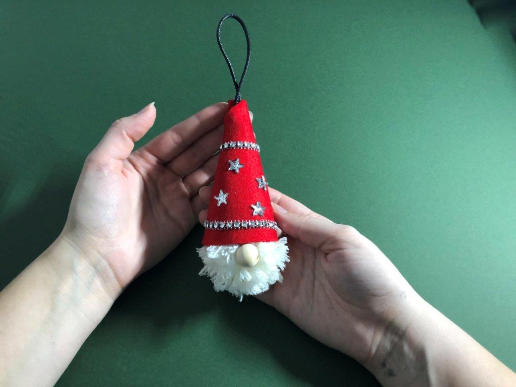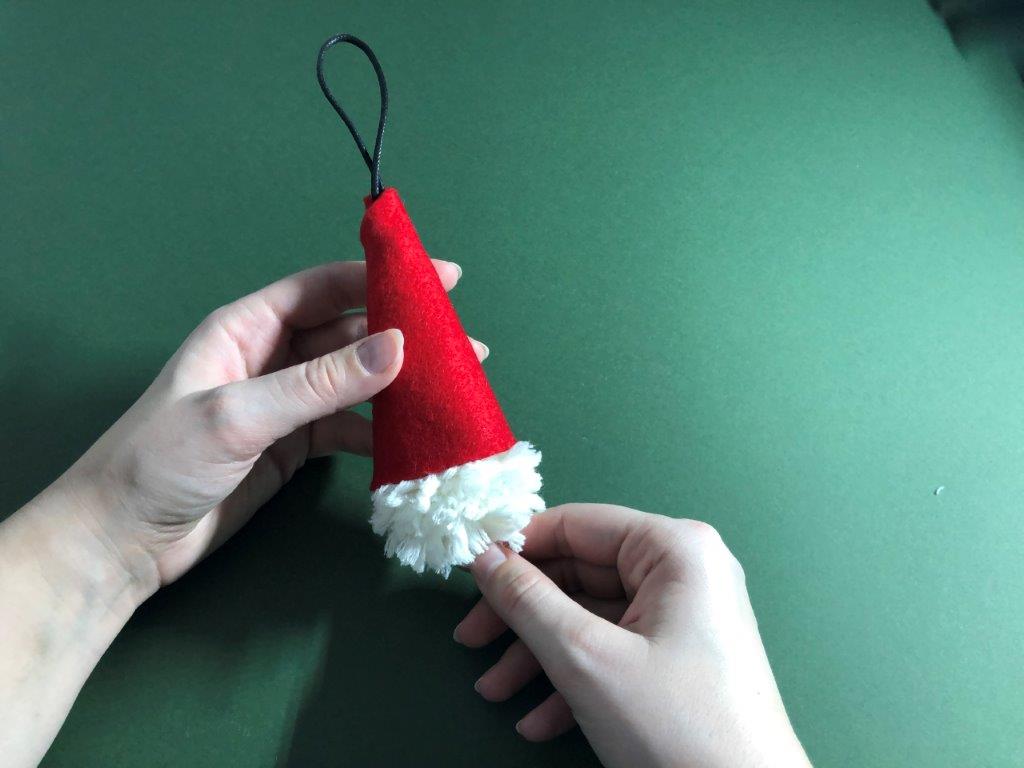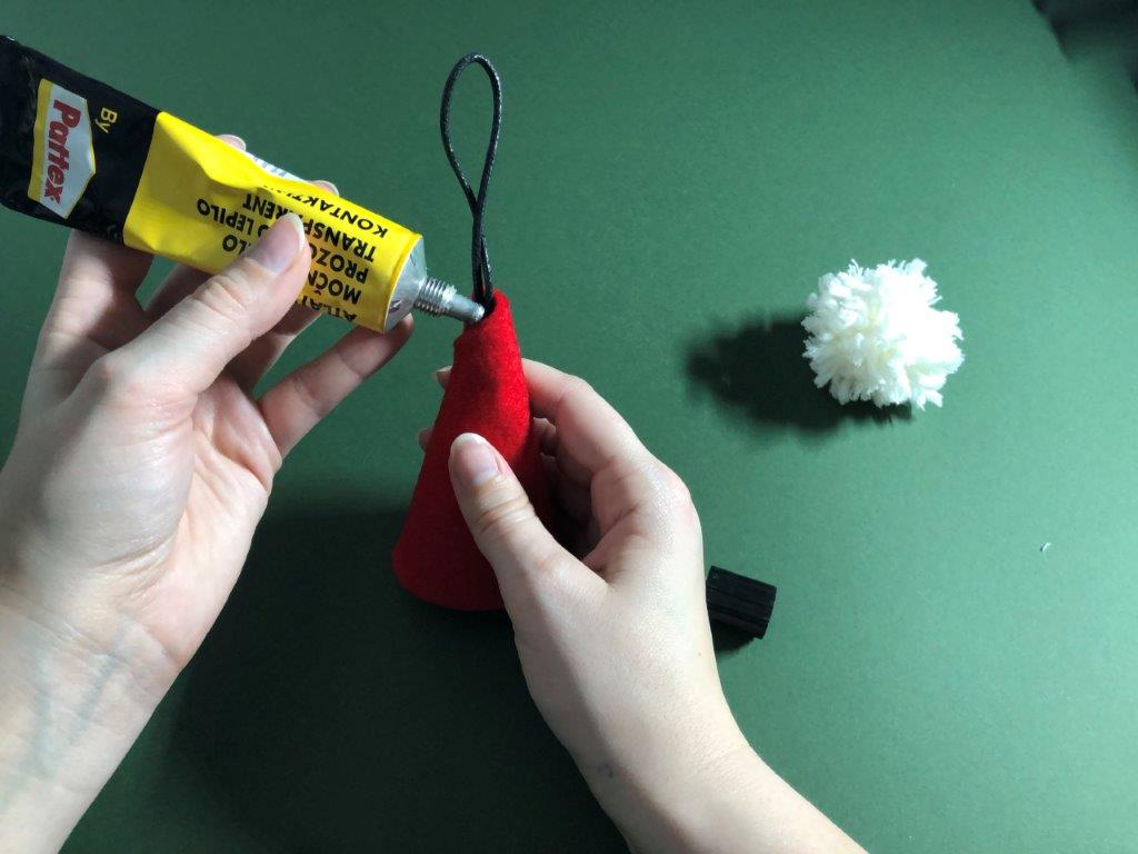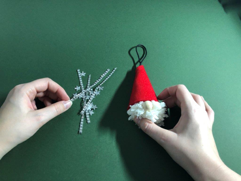 Kapico po želji okrasimo z bleščicami ali kakšnim drugim okraskom. Škratek za smrečico je končan!