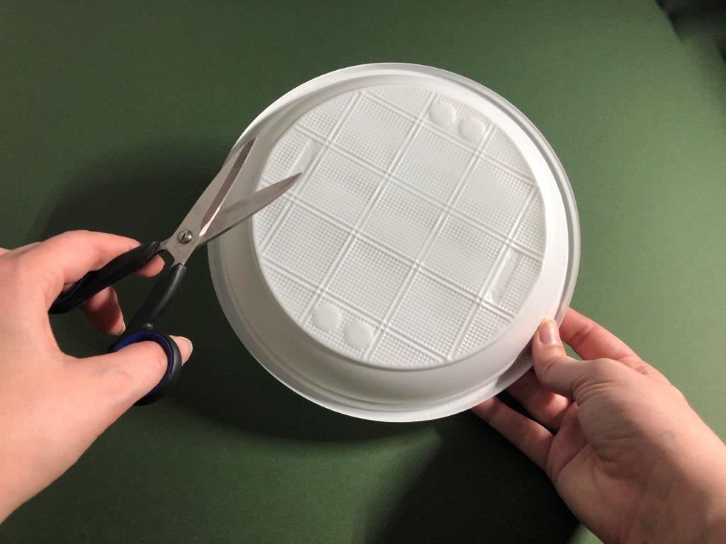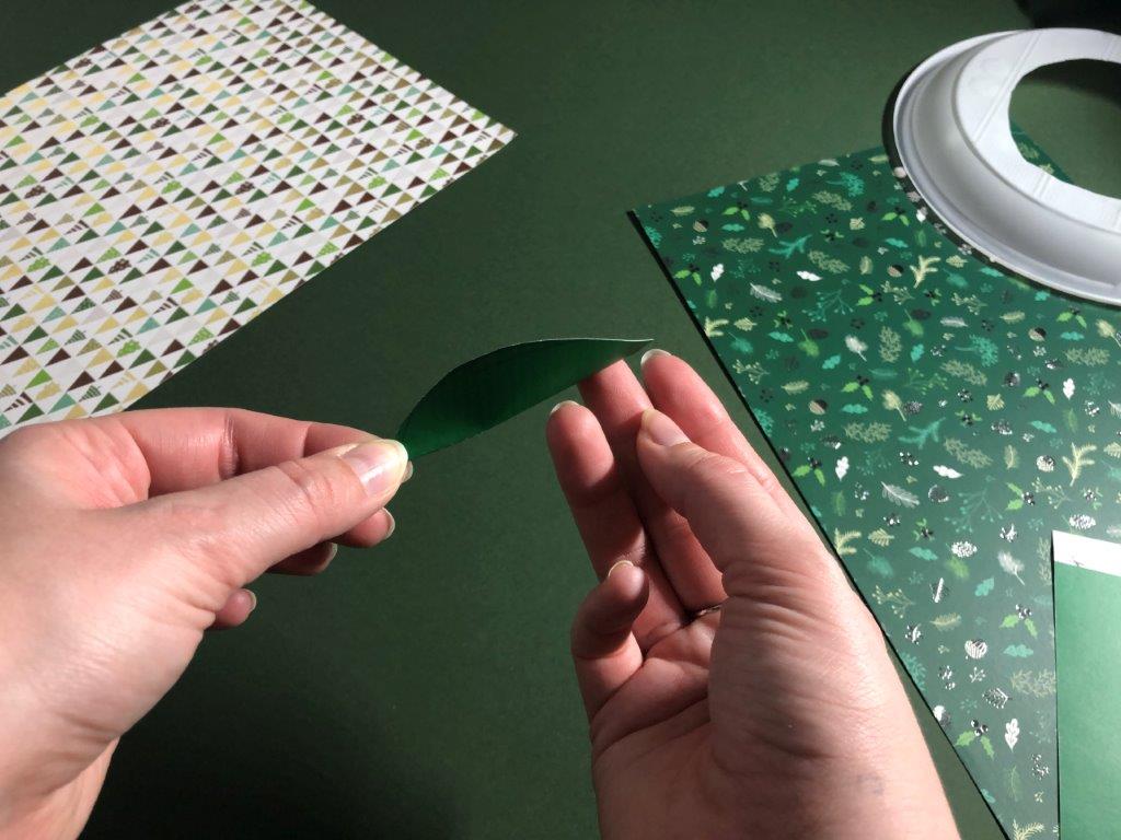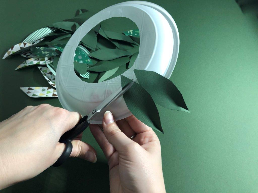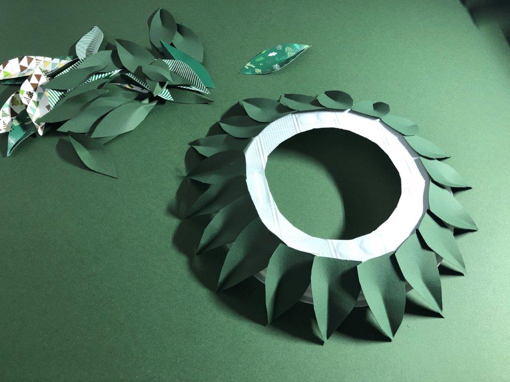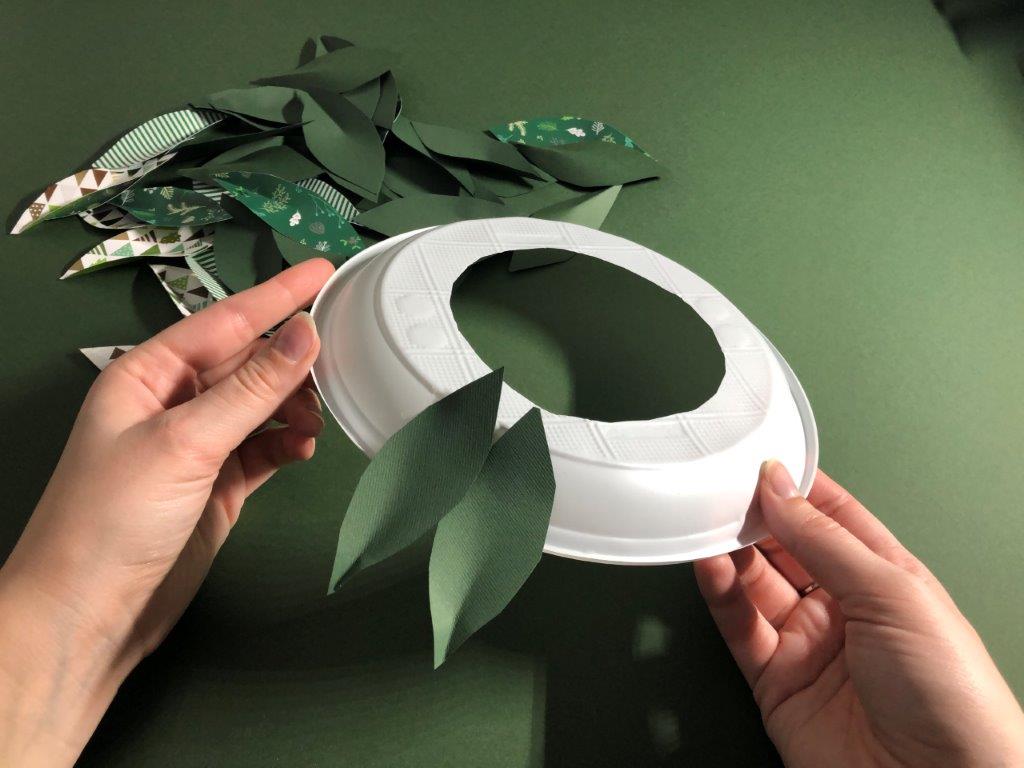 Za osnovo adventnega venčka uporabimo papirnat ali plastičen krožnik, v katerega izrežemo luknjo. Iz raznobarvnega papirja (kolaž, revije, časopisni papir,…) izrežemo listje, ki ga na eni strani prepognemo do polovice. Na narobe obrnjen krožnik v pasovih prilepimo listje. Če smo izrezali velike liste, v prvem pasu listom porežemo konice, ki štrlijo proti sredini krožnika. Ko pokrijemo celoten krožnik, venčku dodamo še okraske po želji (bleščice, rožice, storžke …)